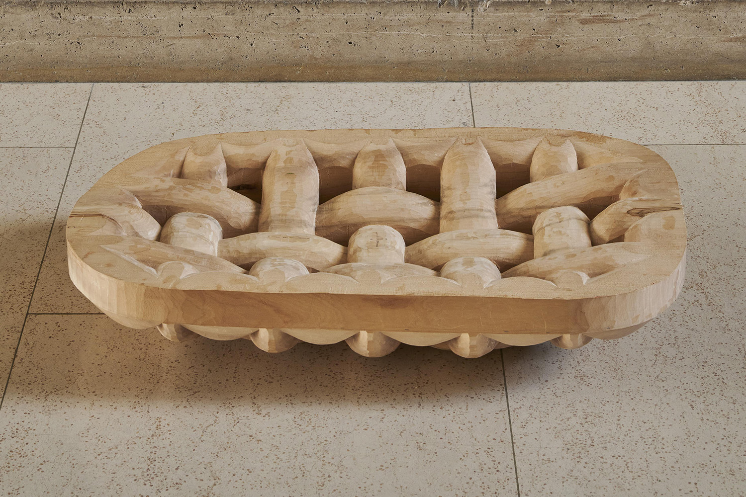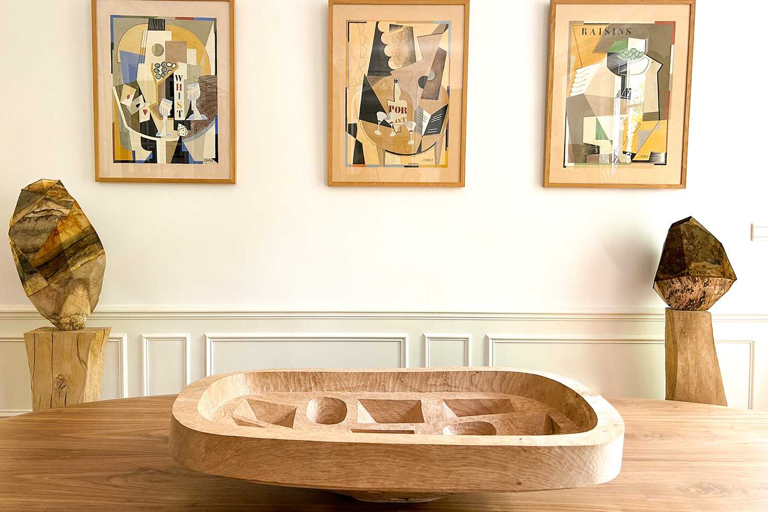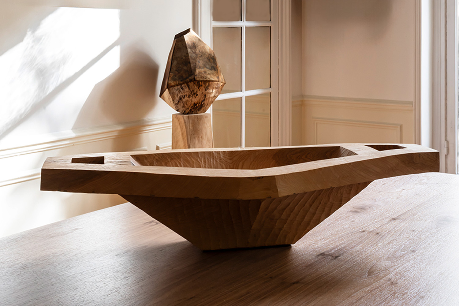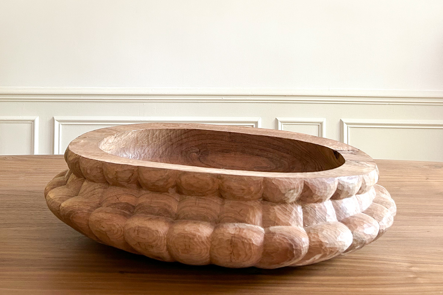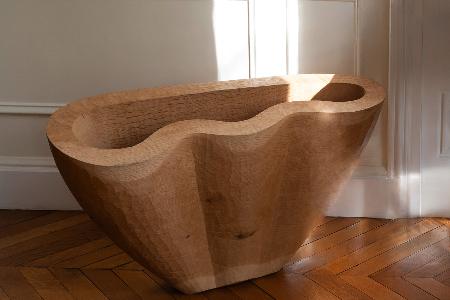 Julian Schwarz sublime des pièces de bois monumentales et intensifie leur esthétique par un long travail de sculpture, à la fois sobre et sensuel. La forme et le veinage naturel du bois, ses accidents, orientent les choix créatifs de l’artiste. Inspiré de l’art roman et son absence d’artifice, Julian Schwarz crée des « vaisseaux », alliant à l’unisson dimension utilitaire et force sculpturale du bois.