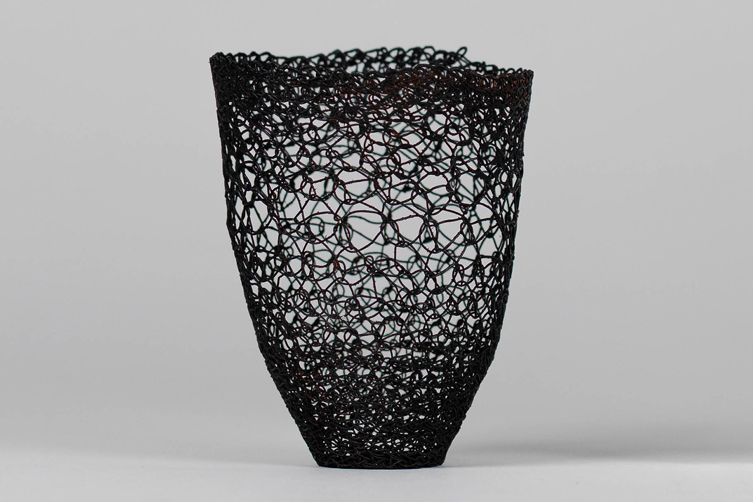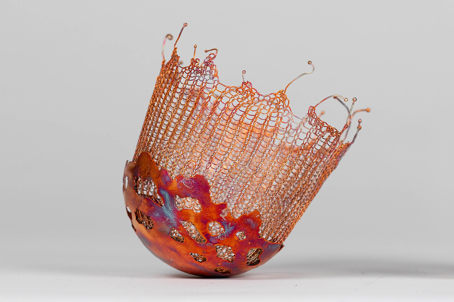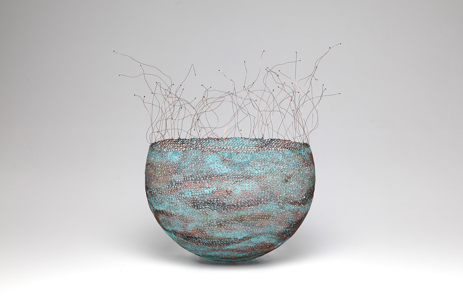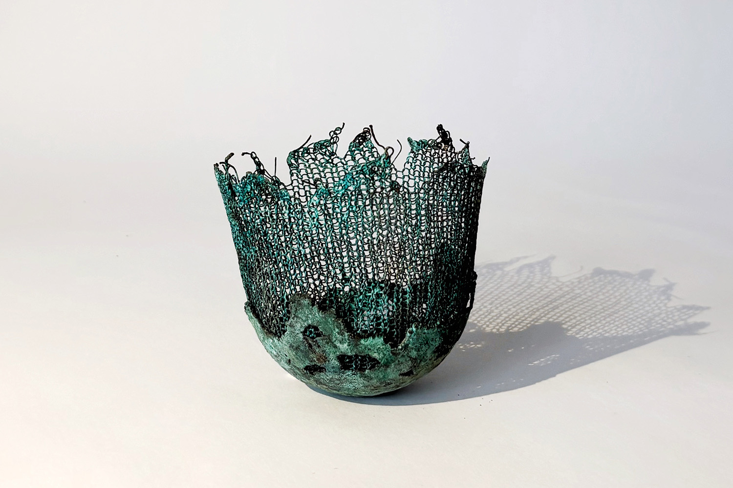Les œuvres de Marta Blanc sont principalement créées à partir de fins fils métalliques – de cuivre, de fer ou d’argent – qu’elle crochète, tricote ou tisse. Les formes se construisent progressivement, avant d’être solidifiées par électrolyse. La durée de l’électrolyse peut varier, allant de quelques heures à plusieurs mois. Au fil du temps, des particules de cuivre se déposent lentement sur la surface de l’objet, tandis que des finitions au chalumeau, à l’ammoniac ou par l’application d’émaux donnent leur coloration aux pièces.