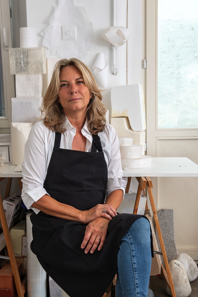 Pour la série Fonction Oblique, Valérie Jolly moule des formes longues et élégantes en papier de soie qu’elle associe à des pierre taillées, telles que du marbre ou du travertin. La sculpture réalisée en papier créé un effet miroir avec celle en pierre taillée. Nous retrouvons cette même association dans sa toute nouvelle série Tectonic.
