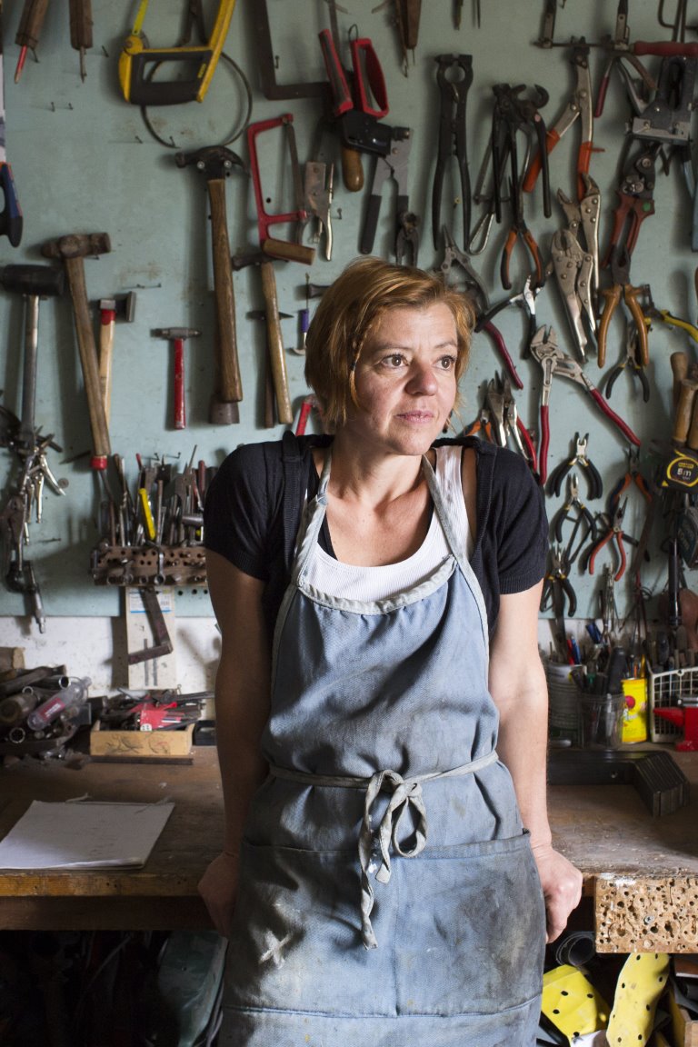 She sculpts monumental and unfinished amphoras with rope, which she them spray-glazes with white stoneware. Limited by the size of the kiln, her ceramic pieces are enhanced by the addition of metal. She cold-hammers the steel before she welds it and applies a patina. Once done, the metal encircles the glazed ceramic – like the mounting of a jewel, or a protective armour.