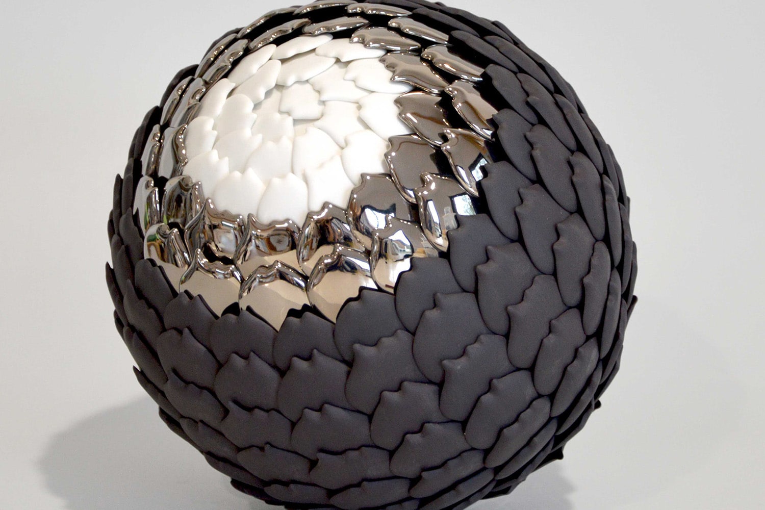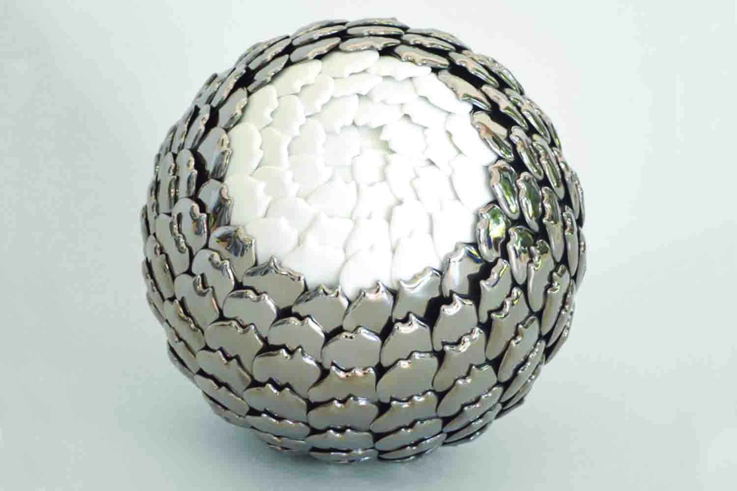 Multidisciplinary, technical mastery has always been central to her work. Her current work focuses mainly on sculpture and porcelain. Her sculptures are composed of scales recreated in ceramic, some bisque, some glazed. These porcelain scales, which the artist assembles, can be used in an infinite number of ways to create volume.