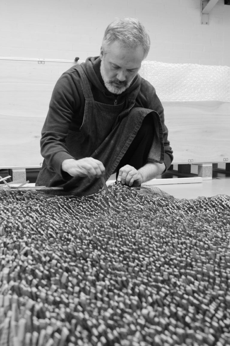 “I discovered this material by chance. Ever since, I’ve been mainly using corrugated cardboard that is dense and wood-like and that allows me to work on all its chromatic nuances.”