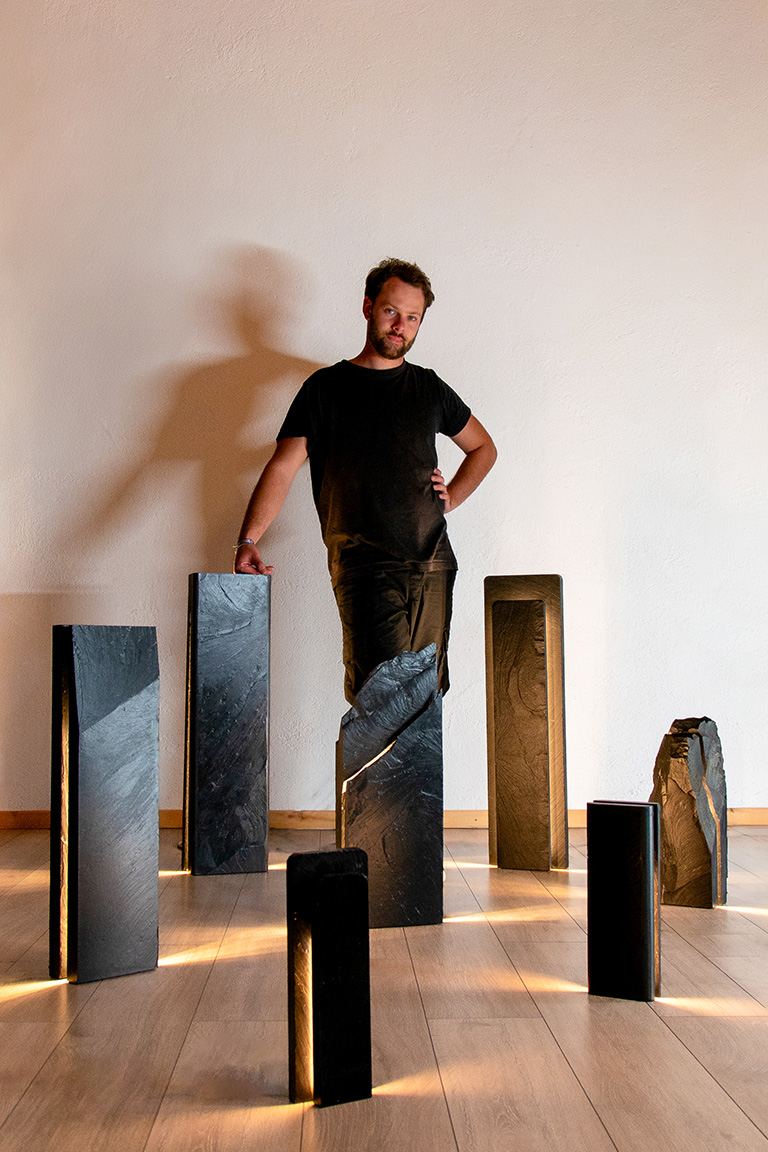 This is why materials are the starting point for his artistic approach. Silas Chermant works with slate from the Pyrenees, transcending its forms and uses, while promoting a little-known French material.