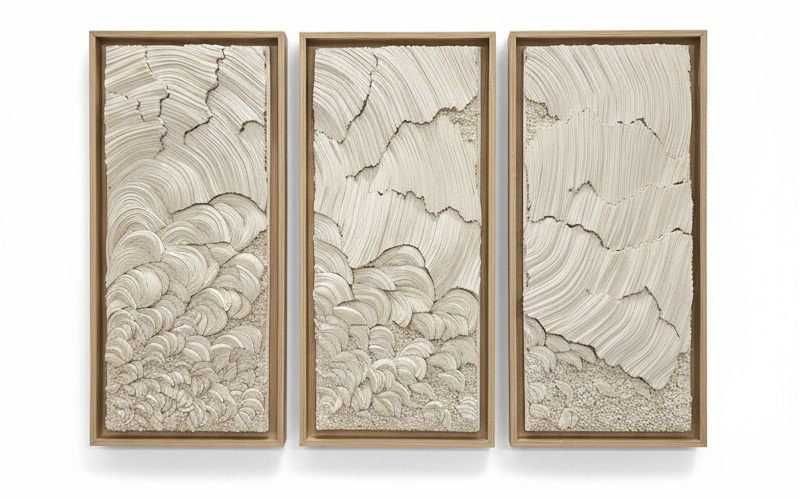 Simone Pheulpin’s mastery of sculptural work allows her to transform strips of raw cotton fabric into works that are in turn coral, shell, moss, bark, fossilised stone, or ivory, reflecting the materials, textures and patterns that have inspired the artist. Mono-material, monochrome, her work opens up an infinite number of possibilities of shapes and volumes. This long and meticulous work of stacking, winding, tightening is for her a meditative process. Concealing the tangled pins that hold her sculptures, the unbleached fabric leaves only an organic trompe-l’oeil to be seen.
