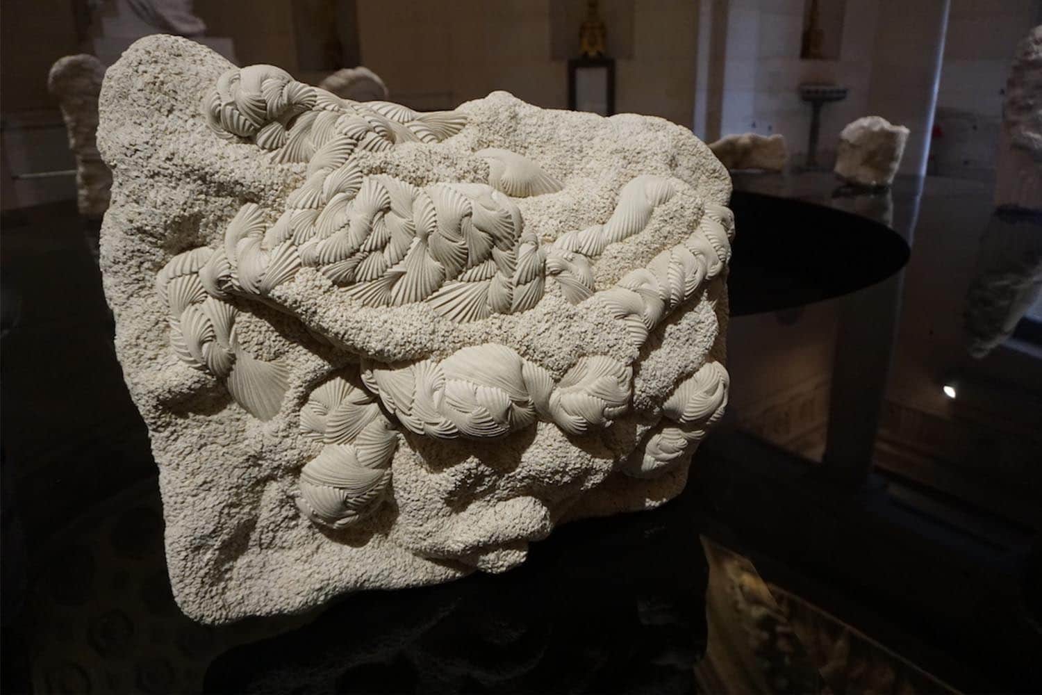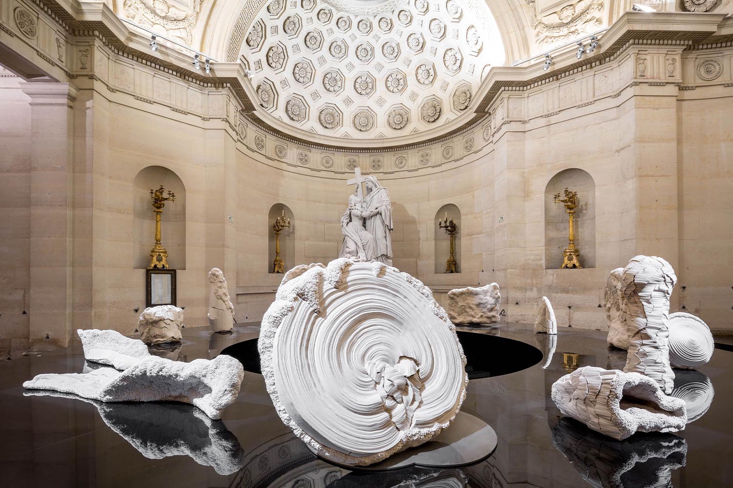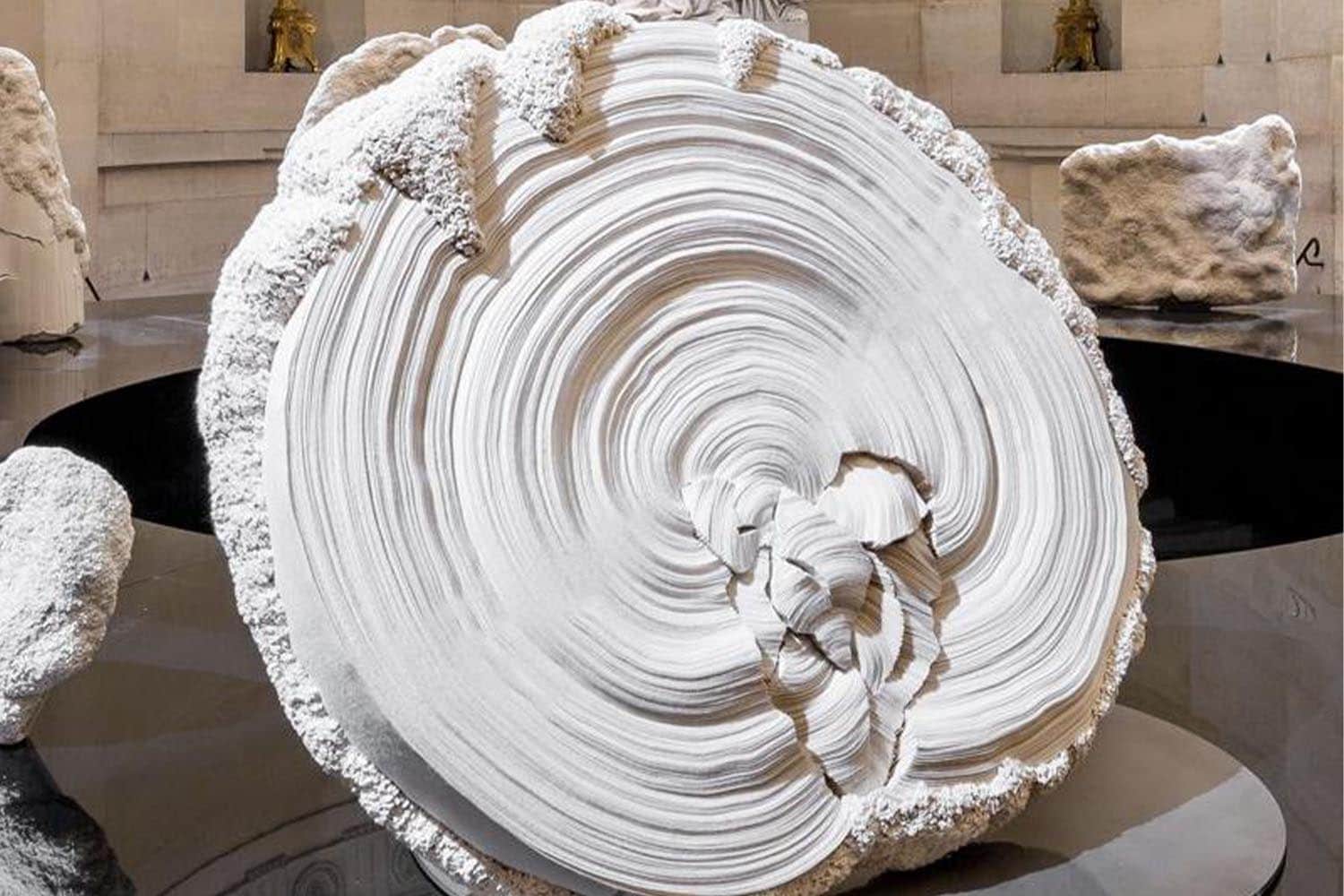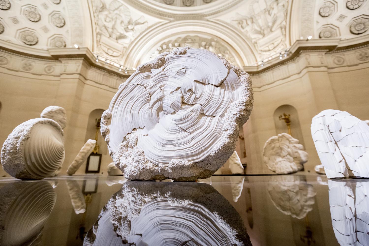 maison parisienne presents a retrospective exhibition dedicated to Simone Pheulpin, recipient of the Prix Le Créateur de la Fondation Ateliers d’Art de France, from November 10 to December 16, 2016. There is something obsessive about Simone’s work: this textile artist has come up with her own artistic language, made of clear yet unpredictable coton folds. Her intriguing sculptures are made of countless bands of raw cotton, meticulously folded and piled on. Some resemble sea shells, others limestone concretions – all of them are the living narrative of Simone’s poetical vision. “Within the Folds” presented the best of 30 years of craft in the historic location of La Chapelle Expiatoire. In this stroll in and out of time, Simone’s artworks seemed to echo in the architecture, in the marble sculptures and bas-relief of this extraordinary environment.