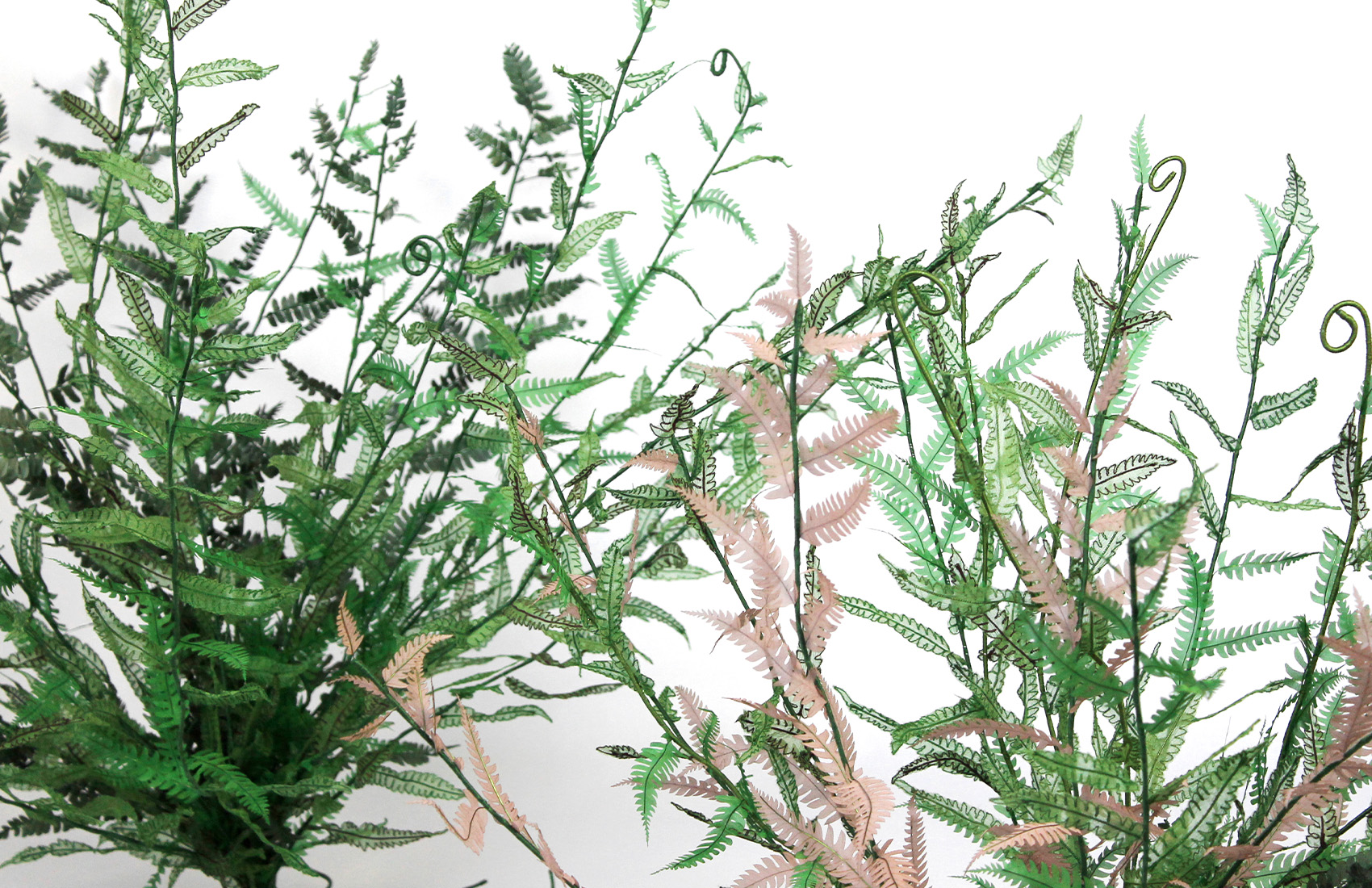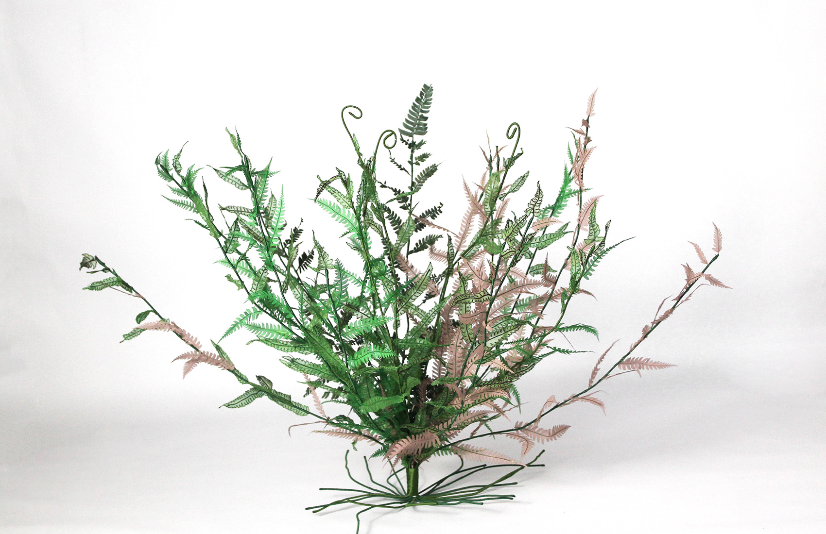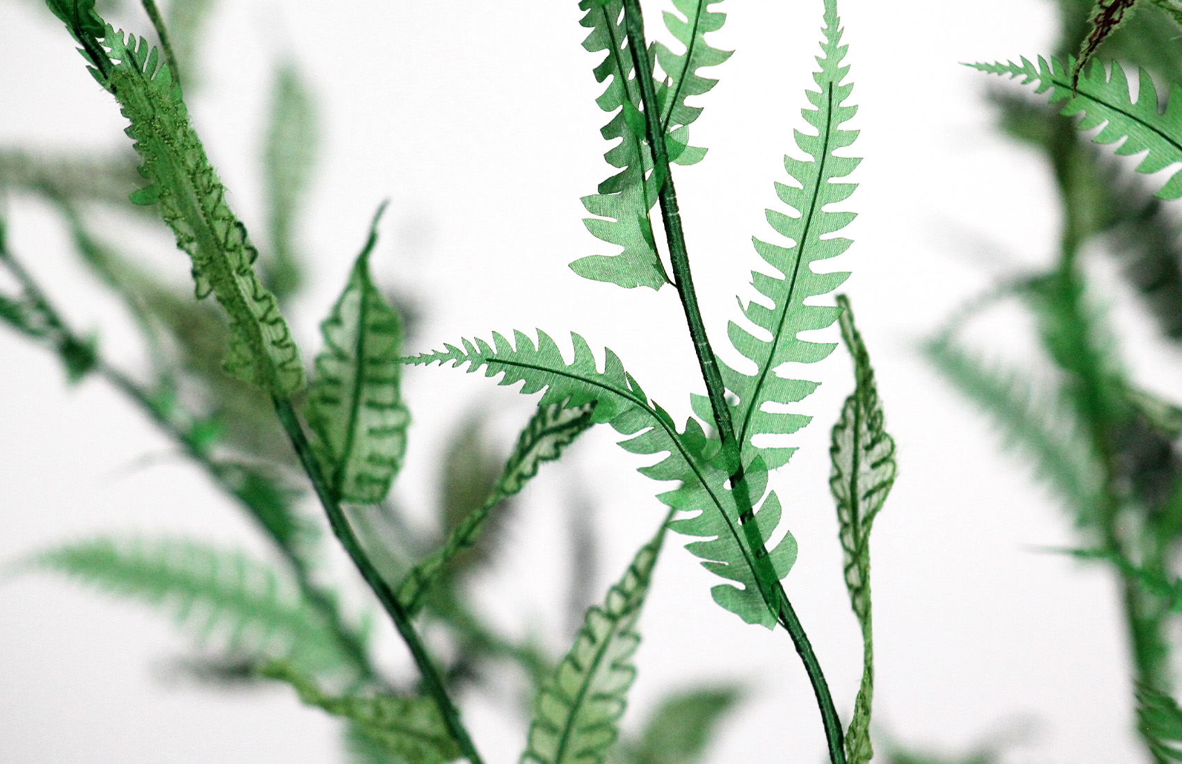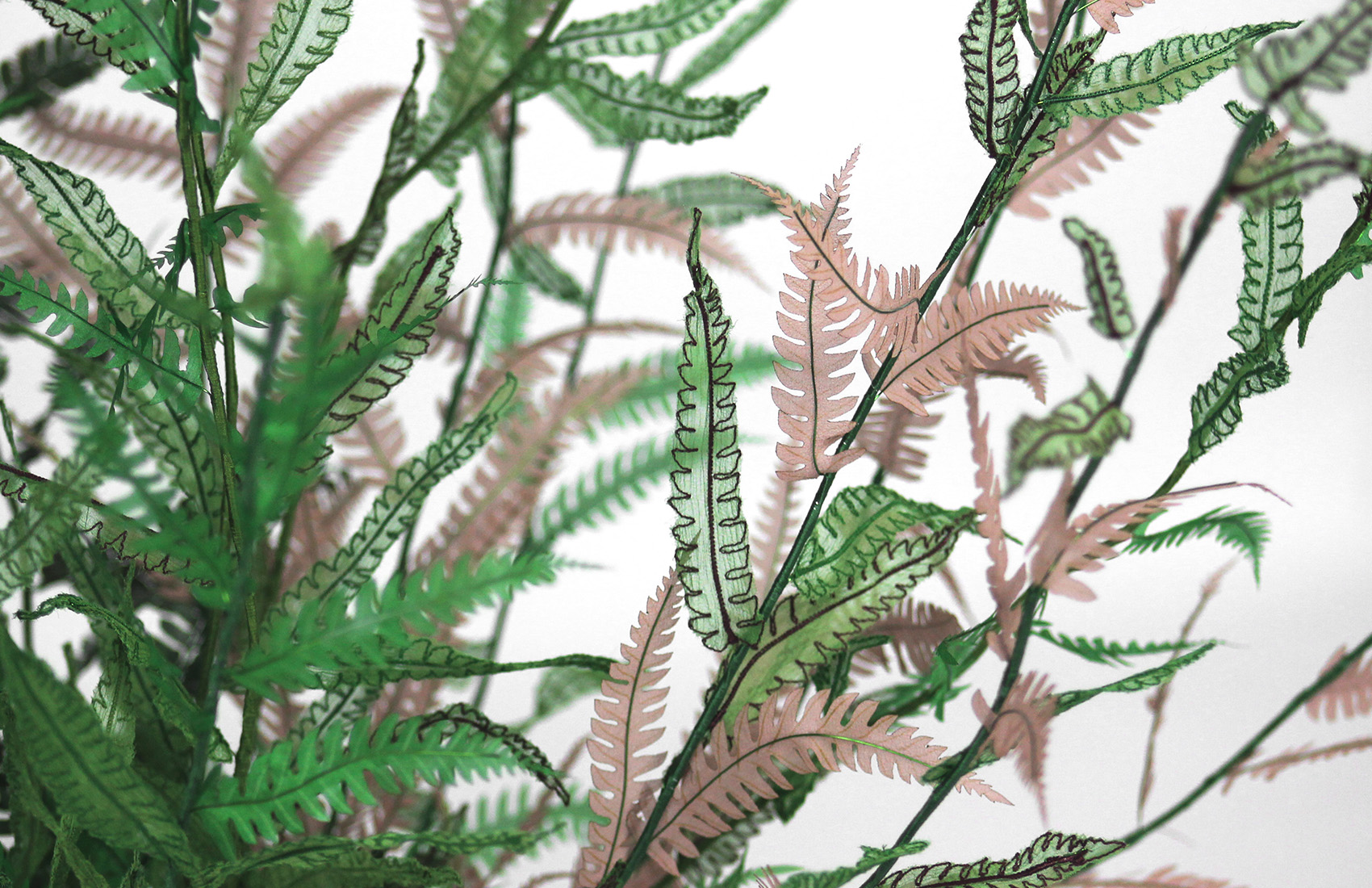 Preserved fern, embroidery on silk muslin, silk satin cutouts, cotton threads, metallic threads