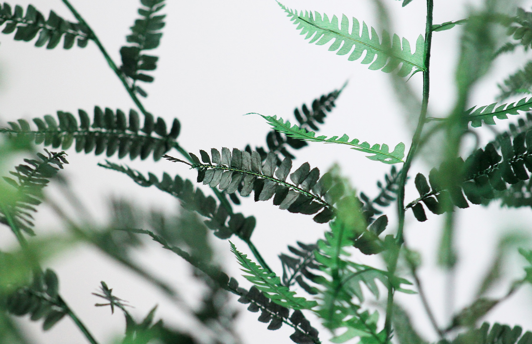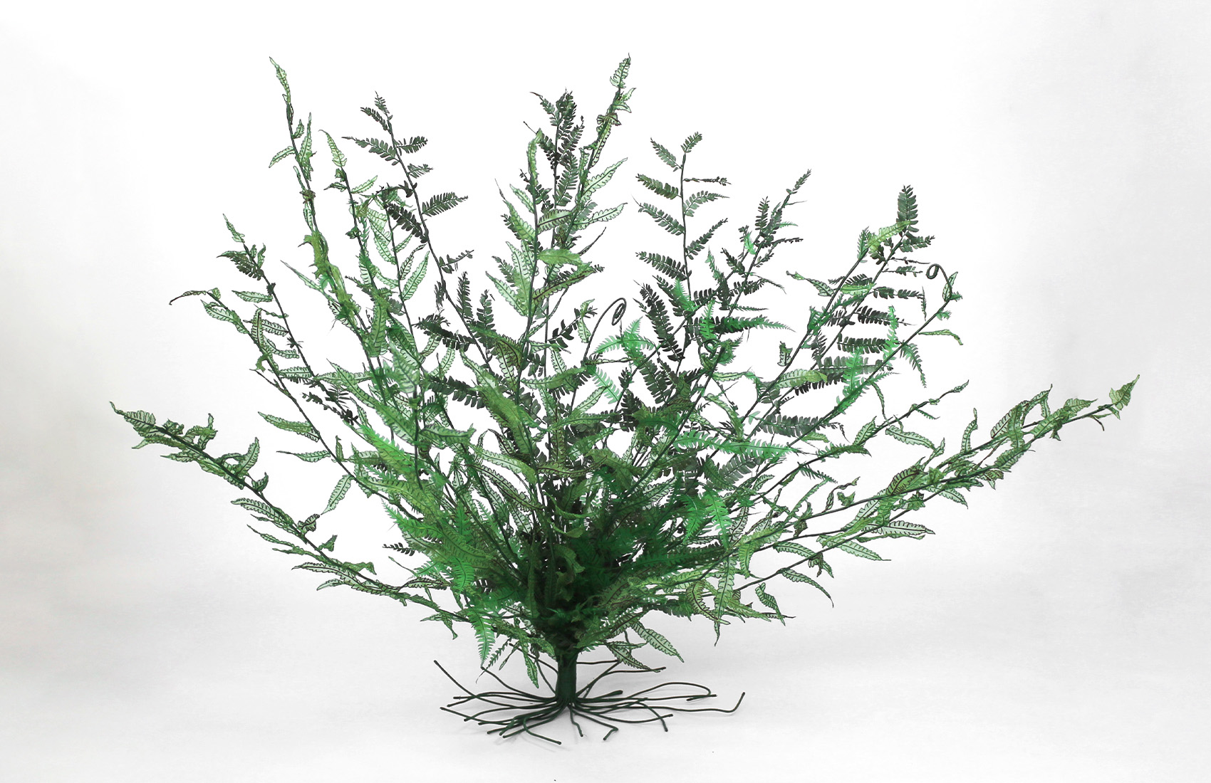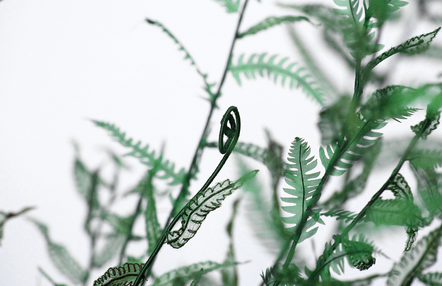 Preserved fern, embroidery on silk muslin, silk satin cutouts, cotton threads, metallic threads
