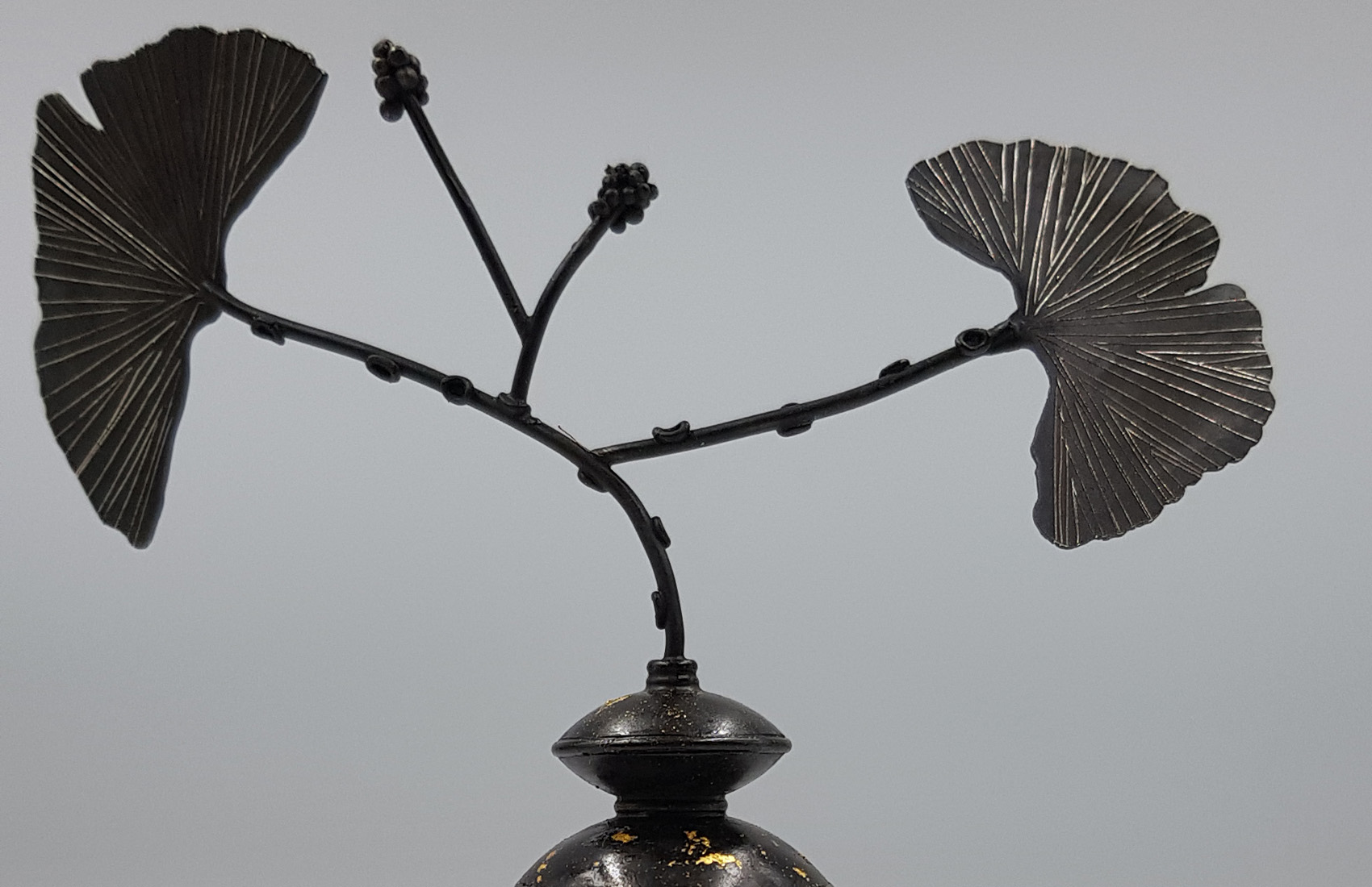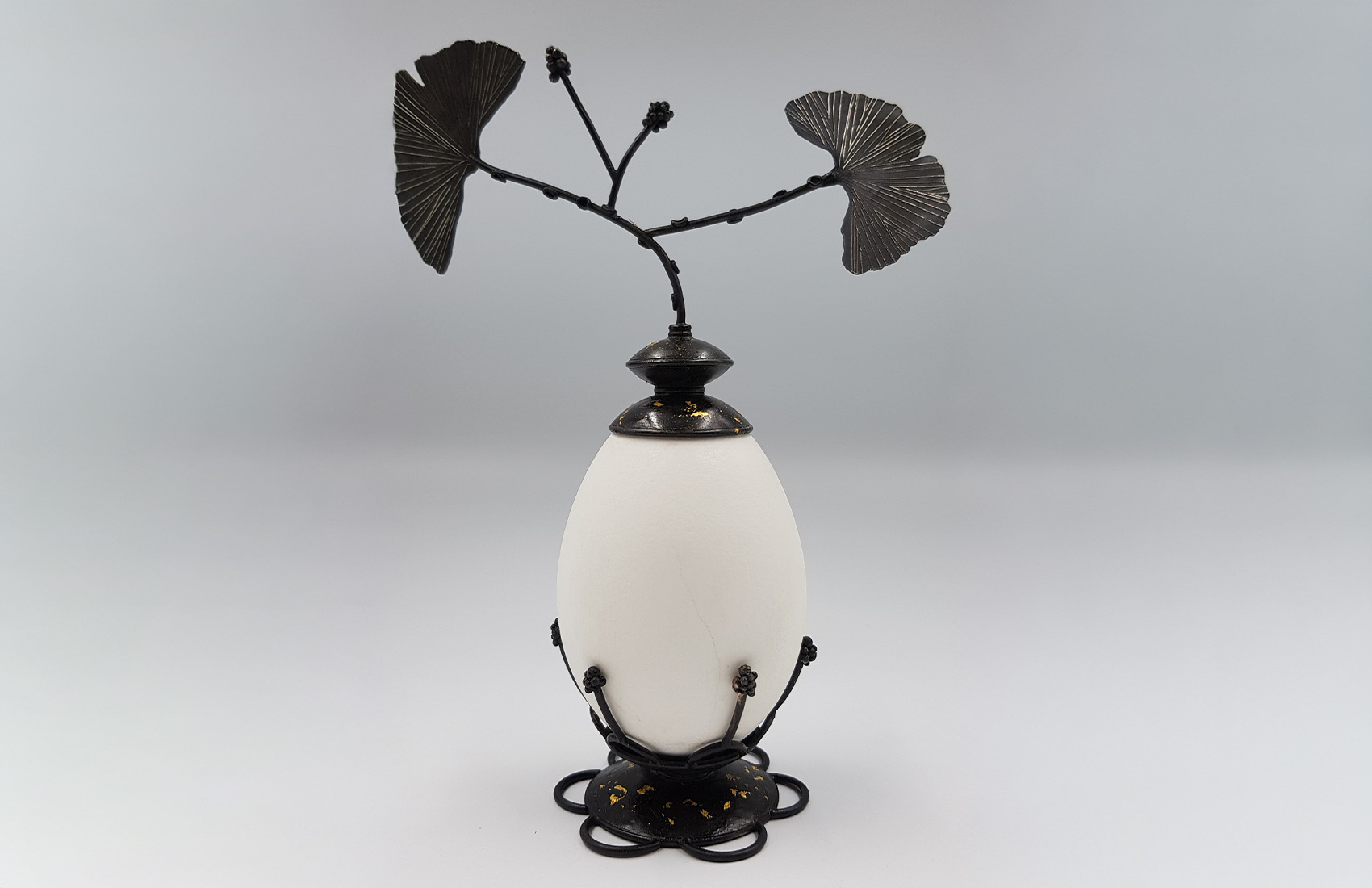 Maillechort forgé patiné, gravé, feuille d’or 22cts, œuf d’oie