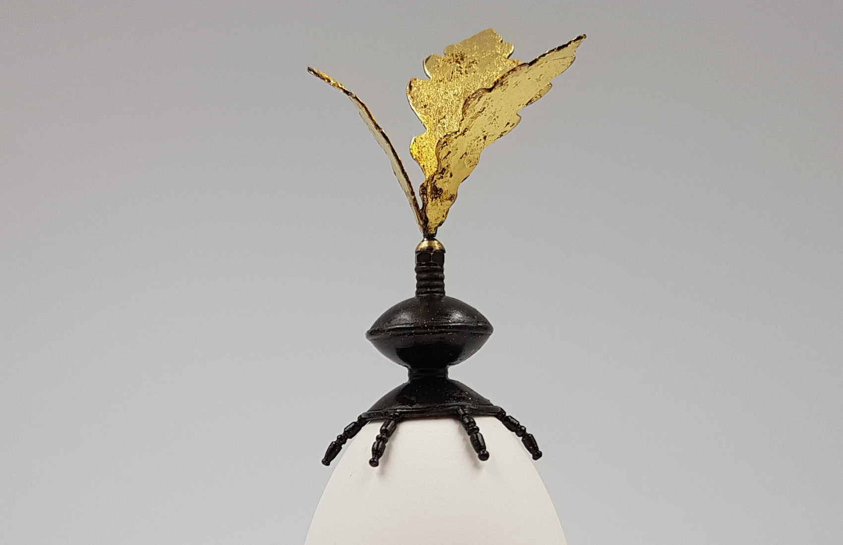 Goose egg, 3 oak leaf motif gilded with 22-carat gold leaf, forged nickel silver with patina finish