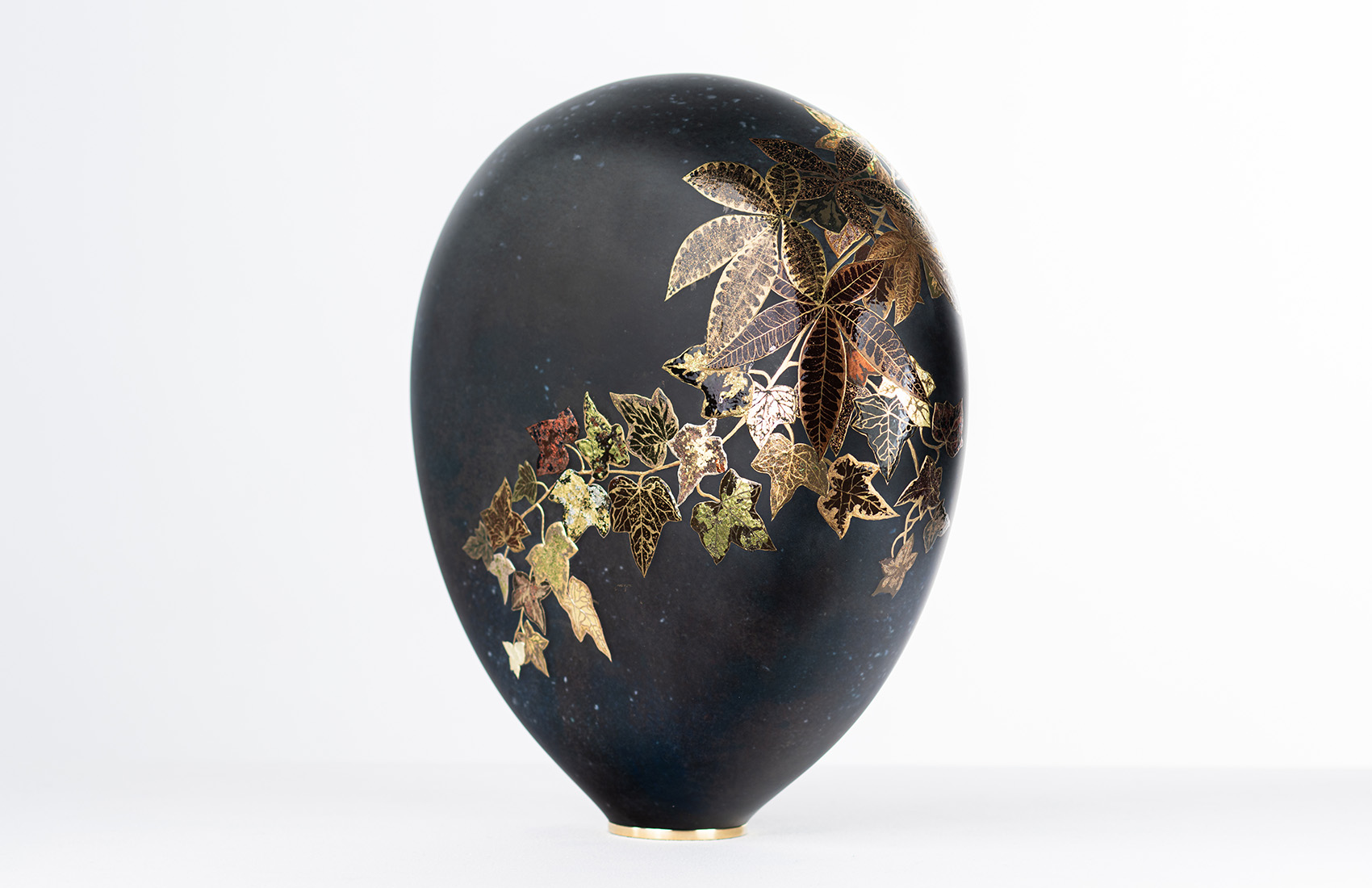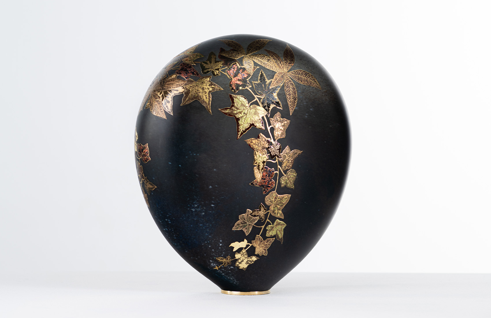Black and gray mouth-blown glass, moiré decoration with colored powders. French lacquer ornamentation with Raphaël brushes made of sable hair, combining gold and bronze powders, colored Japanese silver and gold leaf, flatting varnish, and plant pigments.