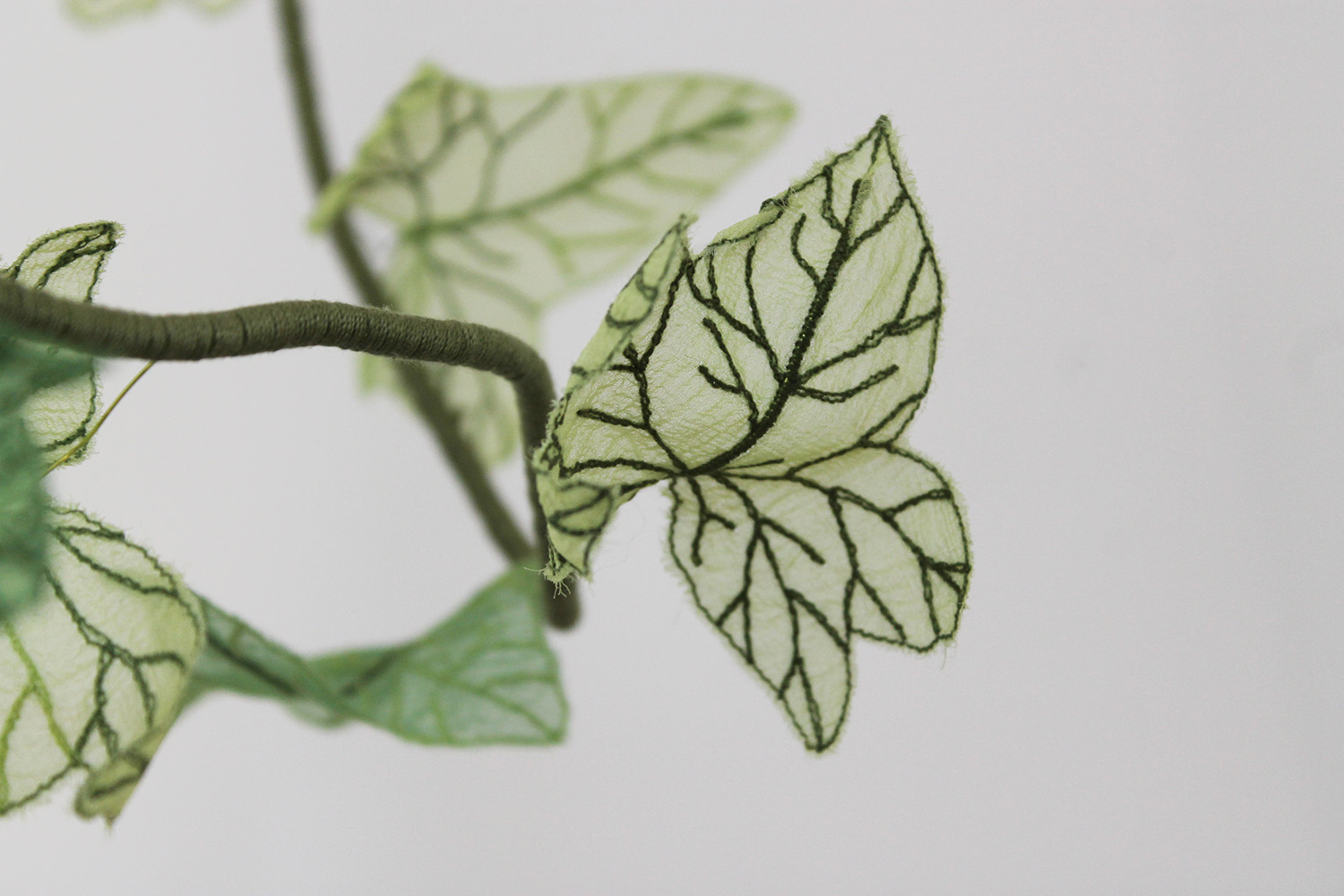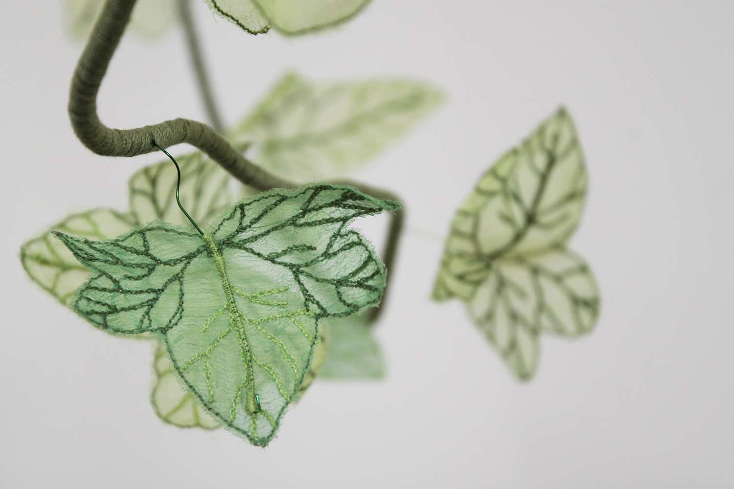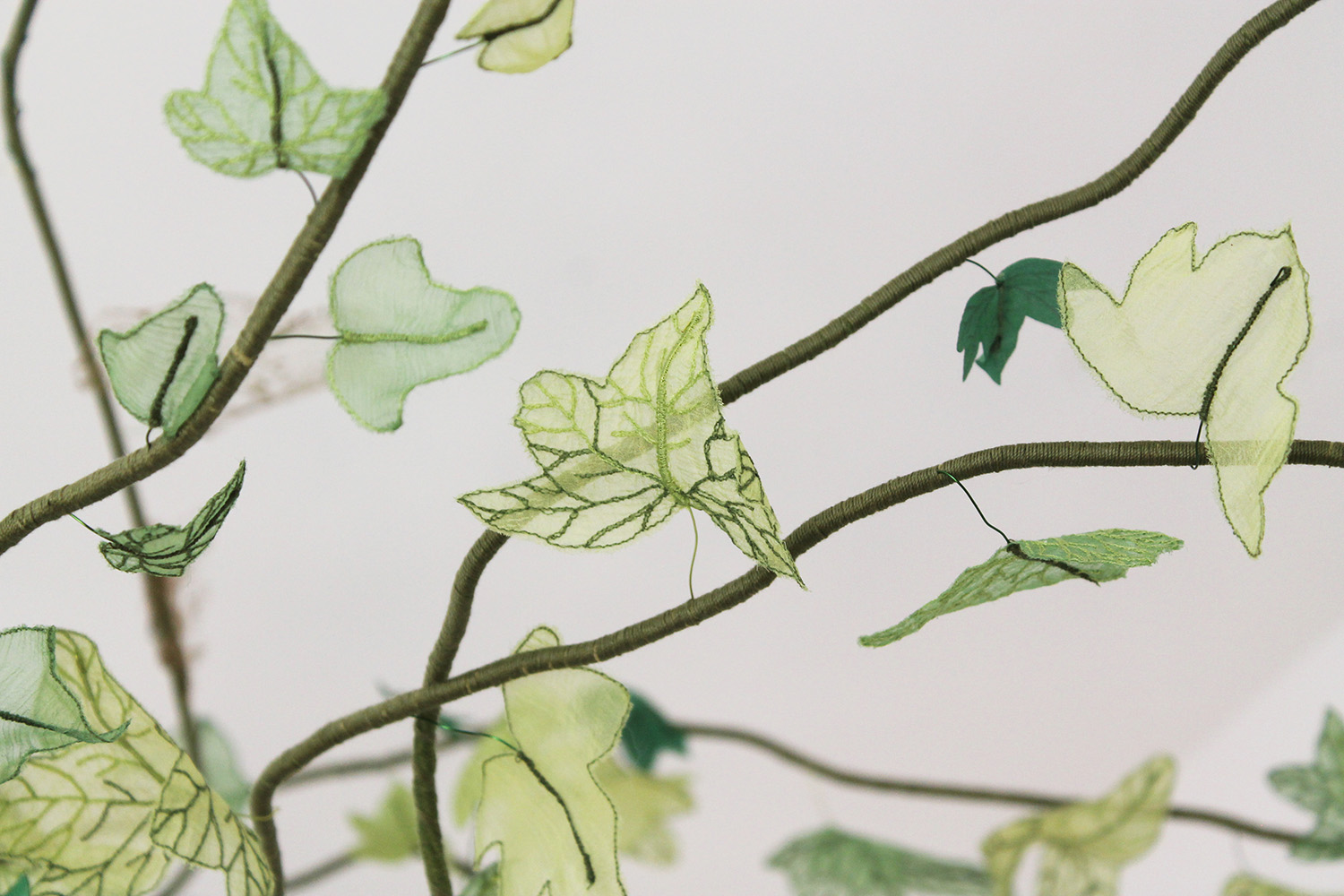 Dehydrated ivy skeletons, embroidery on silk muslin, silk satin cut-outs, threads, metallic threads and cord