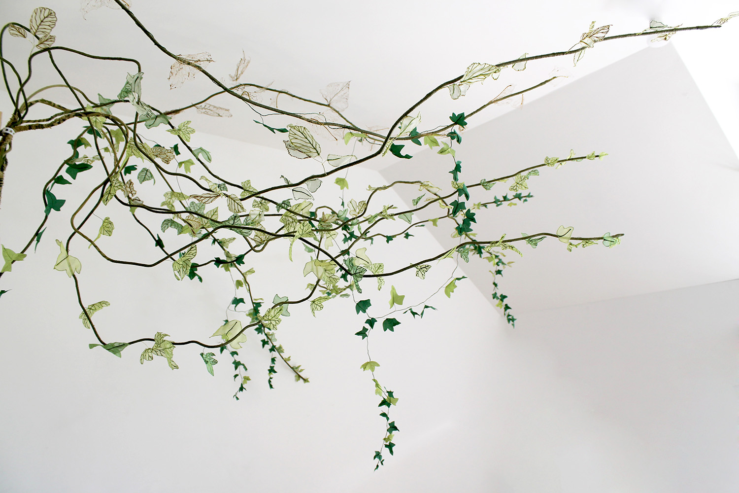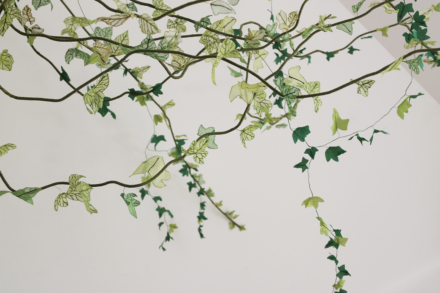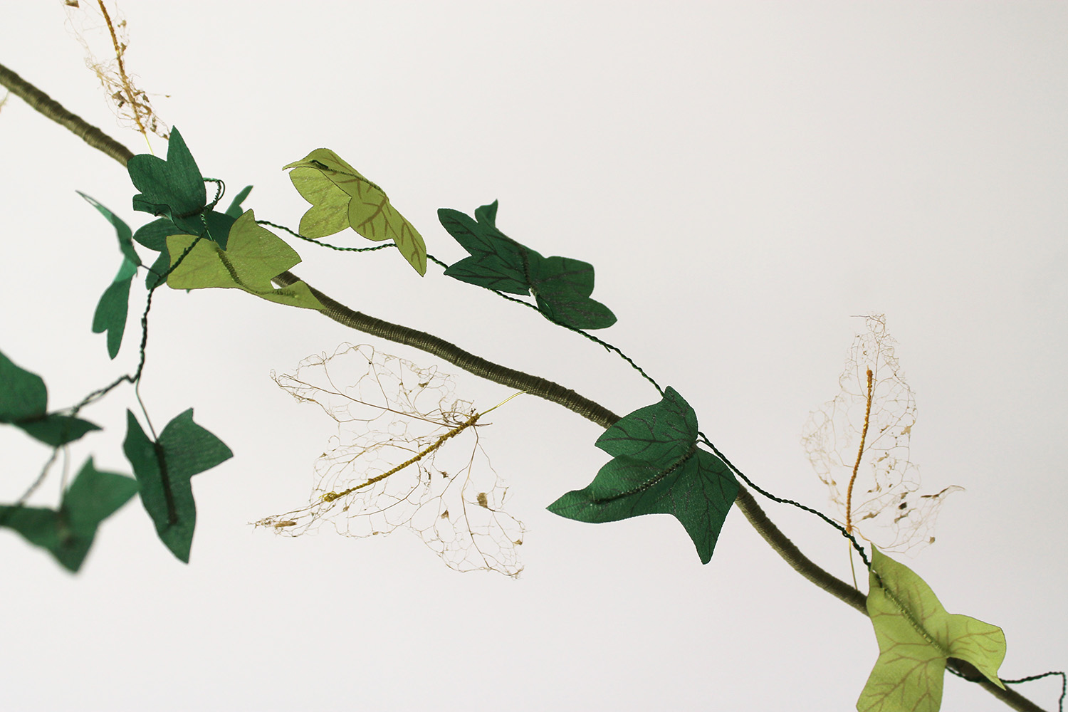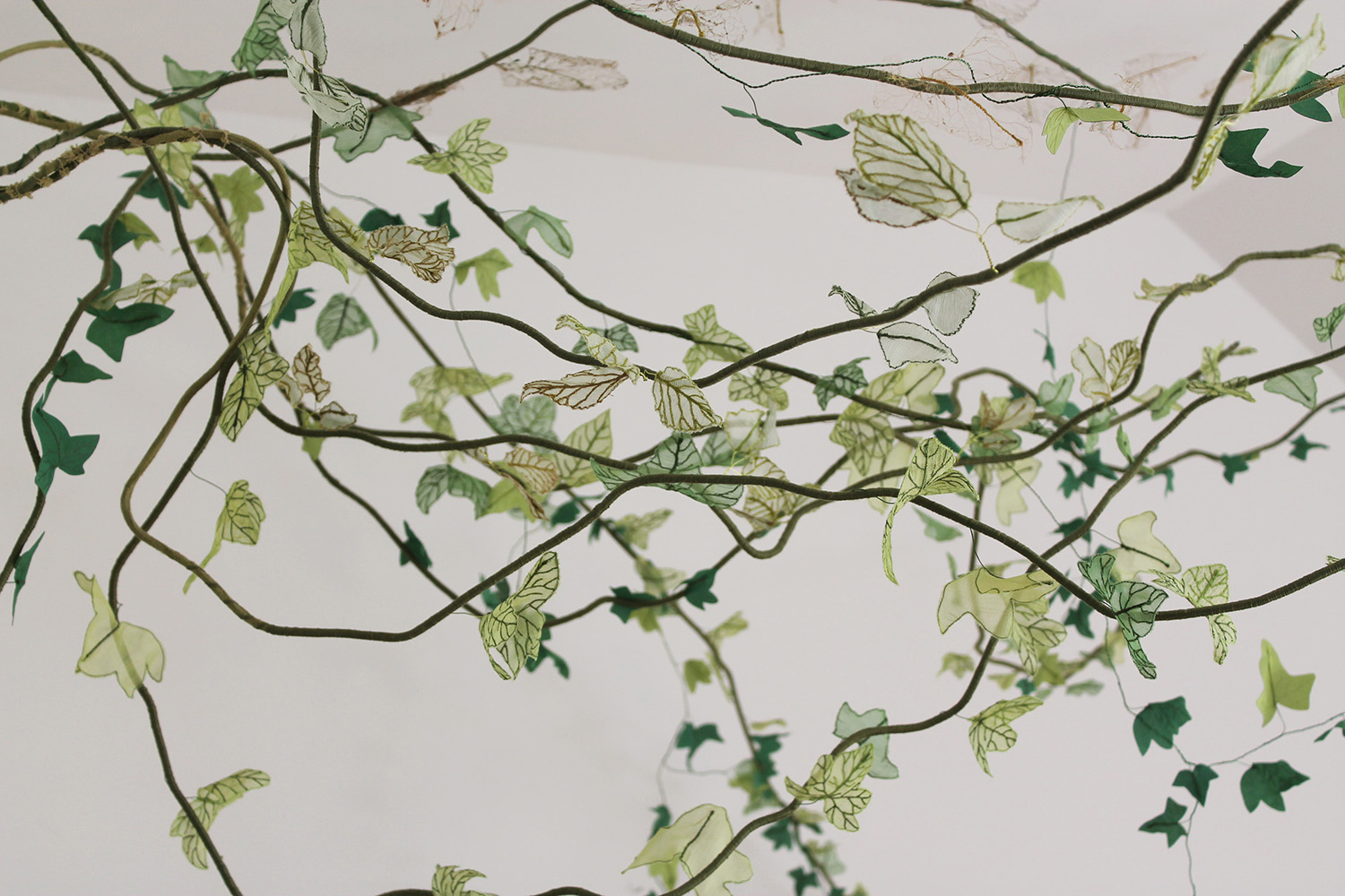 Dehydrated ivy skeletons, embroidery on silk muslin, silk satin cut-outs, threads, metallic threads and cord