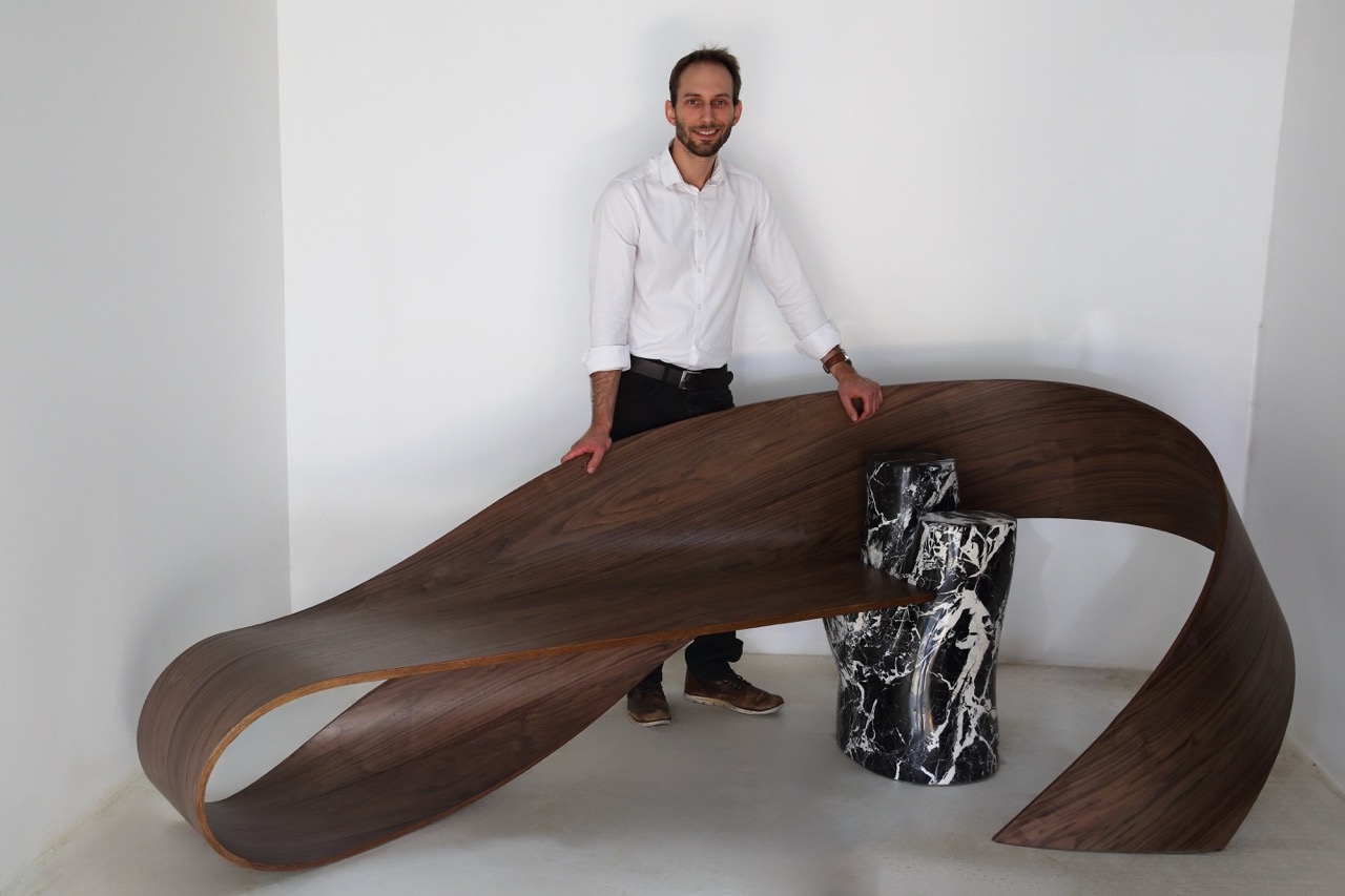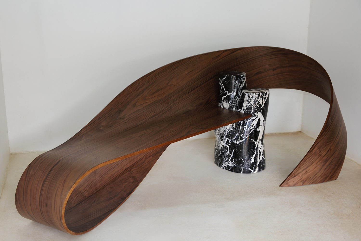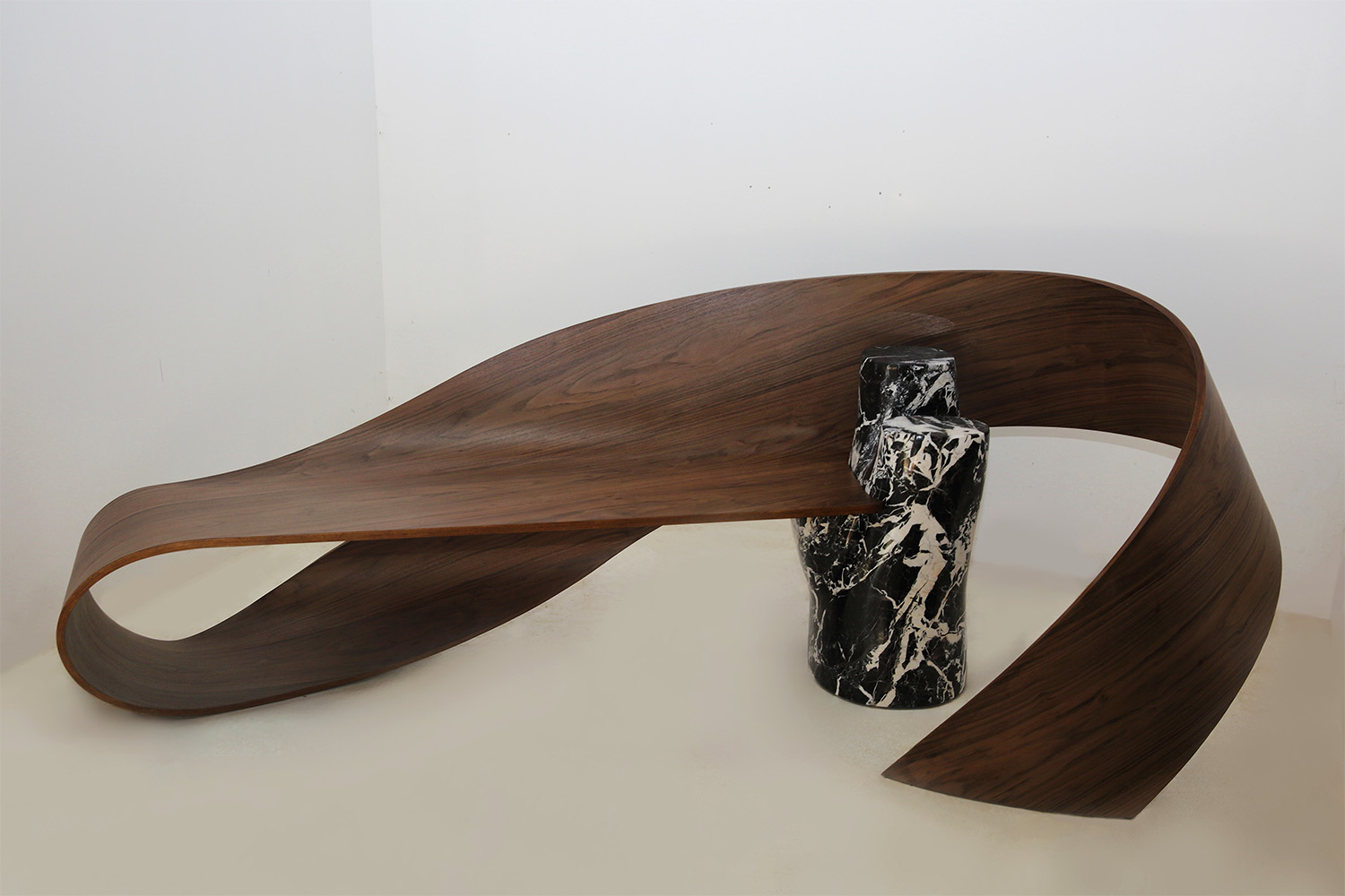Created in collaboration with David Léger, sculptor and stonemason. Created by designer and cabinetmaker Pierre Renart, the wood is curved to embrace the marble. A blend of two precious materials, this bench seat reflects the excellence of French craftsmanship. The artwork is now on display at the Hôtel Solvay in Brussels, where Victor Horta’s Art Nouveau architecture dialogues with the curves of Pierre Renart’s furniture.