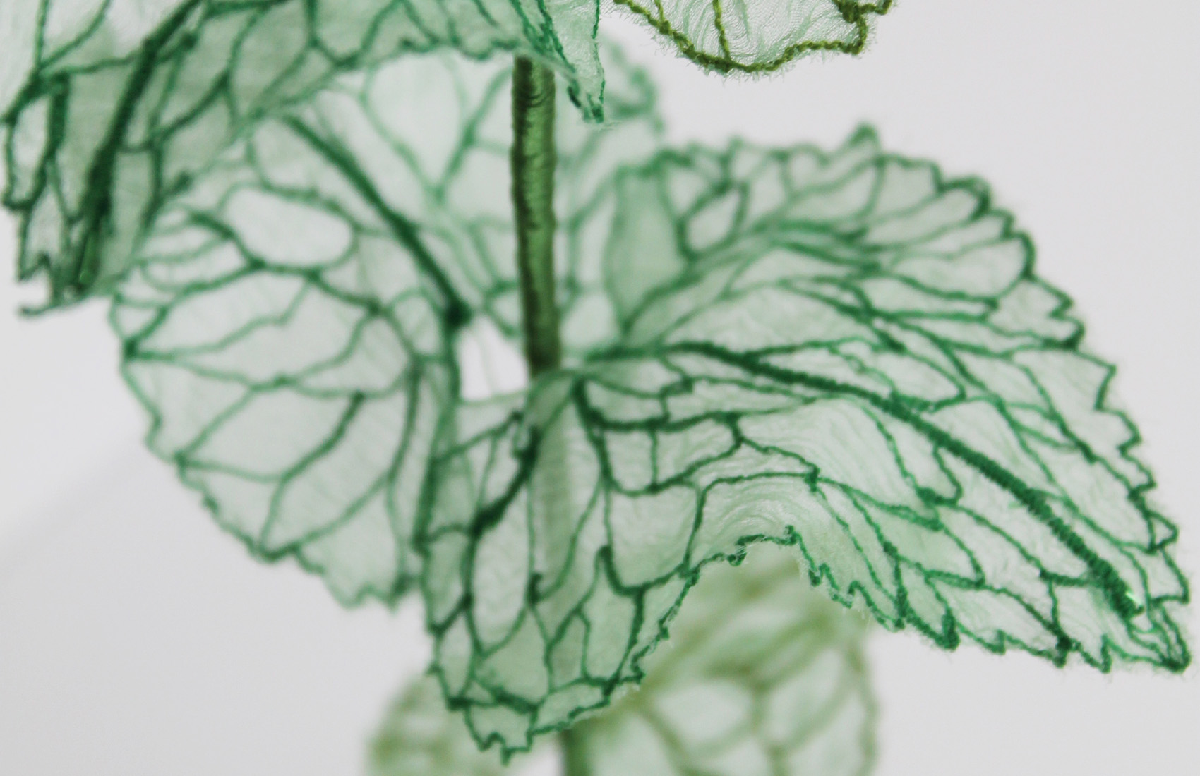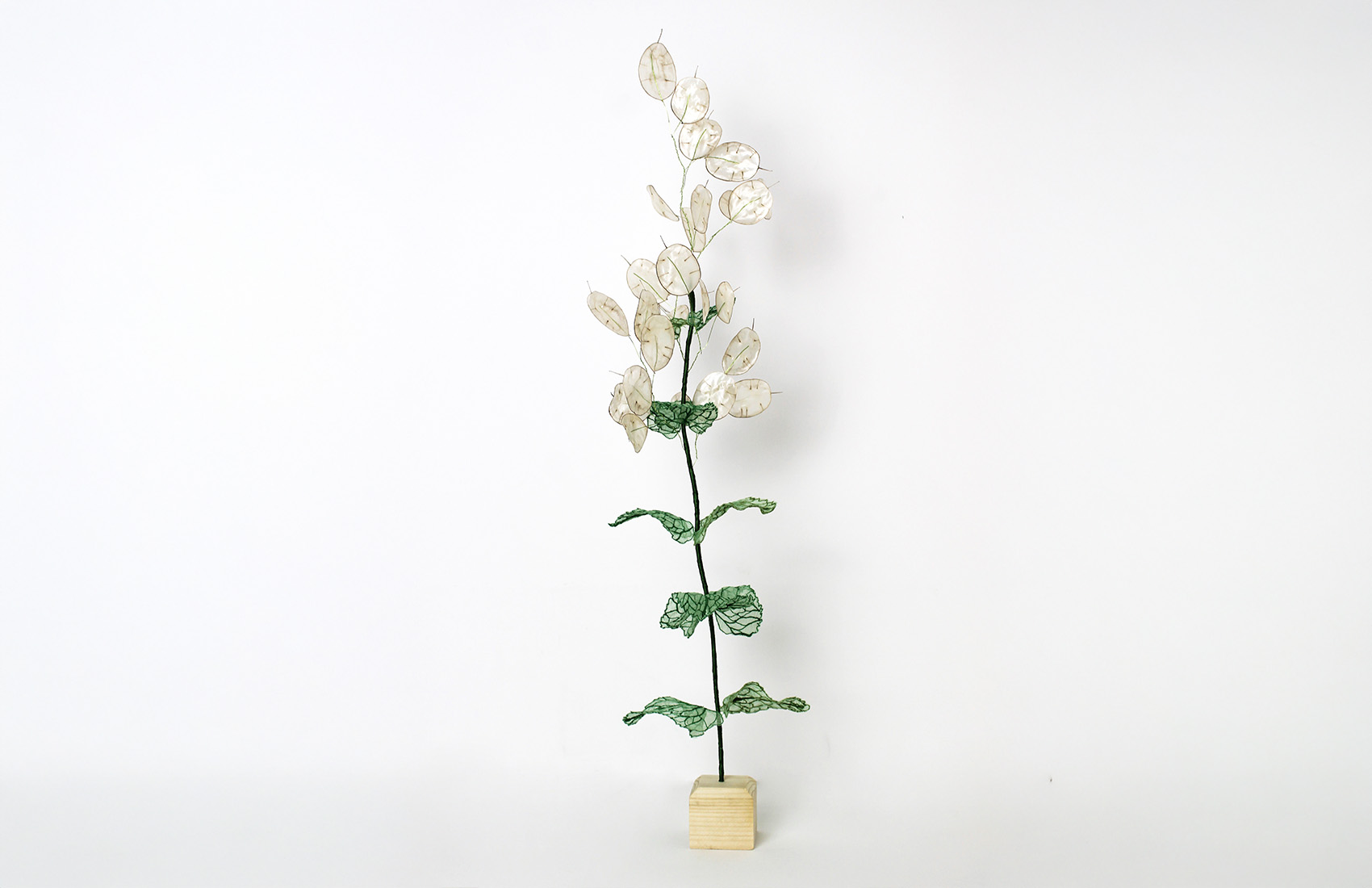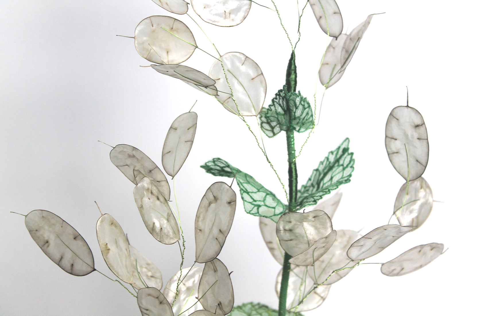 Dried money plant seeds, embroidery on silk muslin, metallic threads, fir wood base.