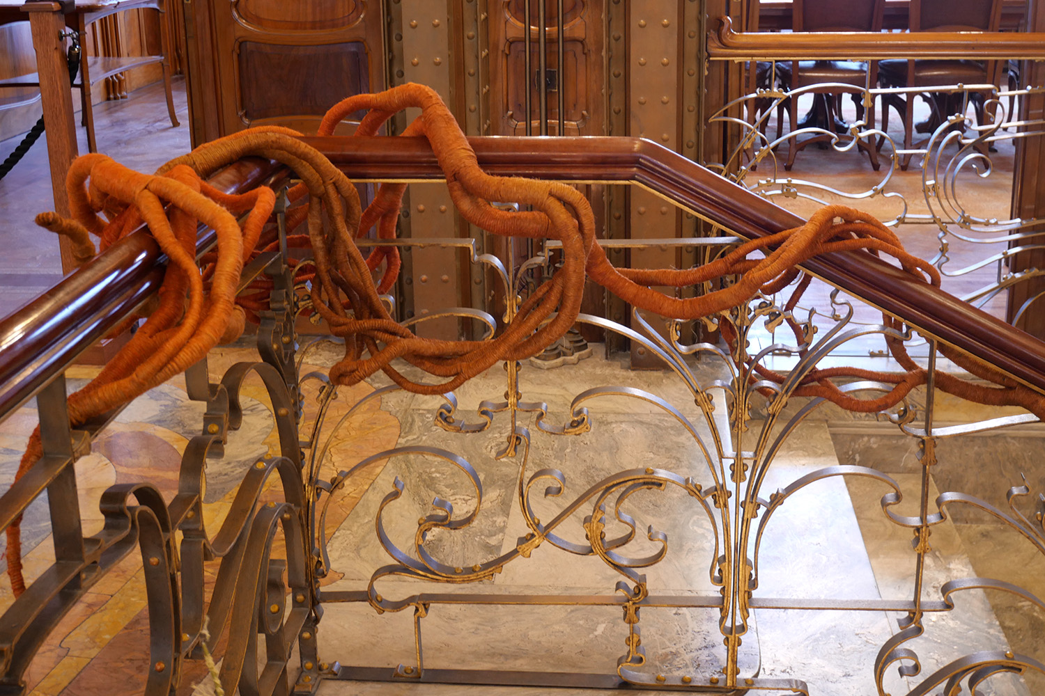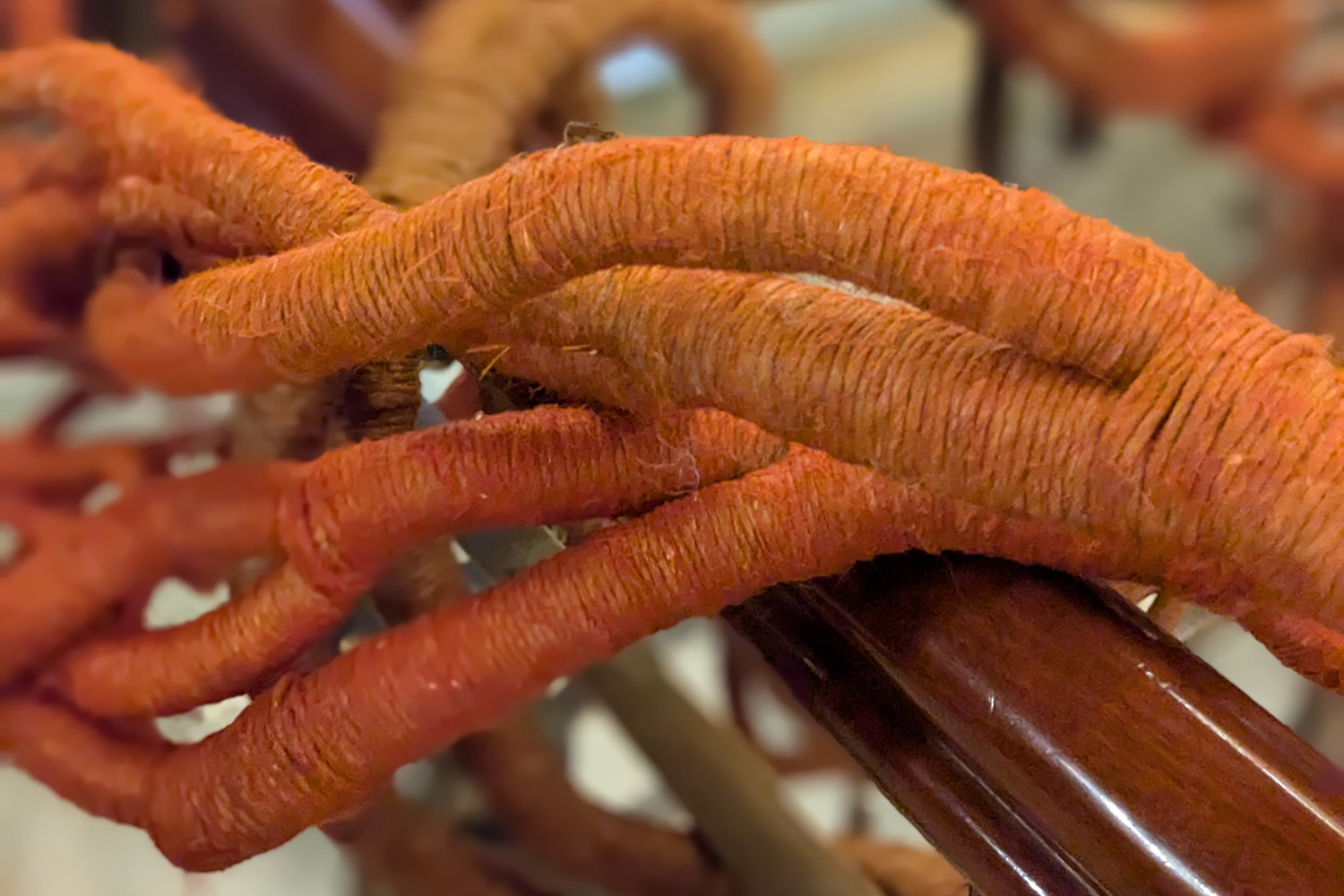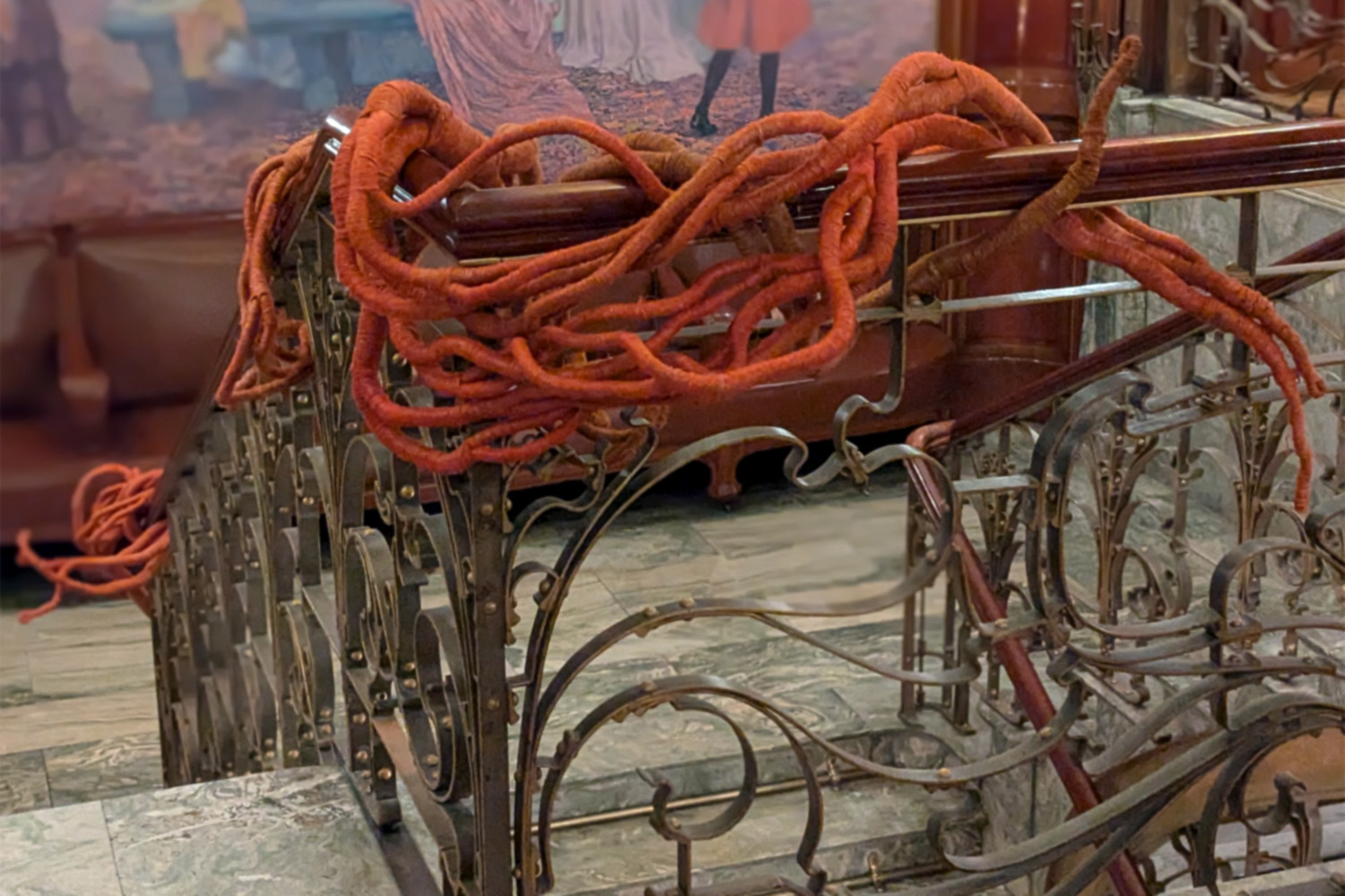 Carved linen, red and dark orange hot dye and coloured ink.