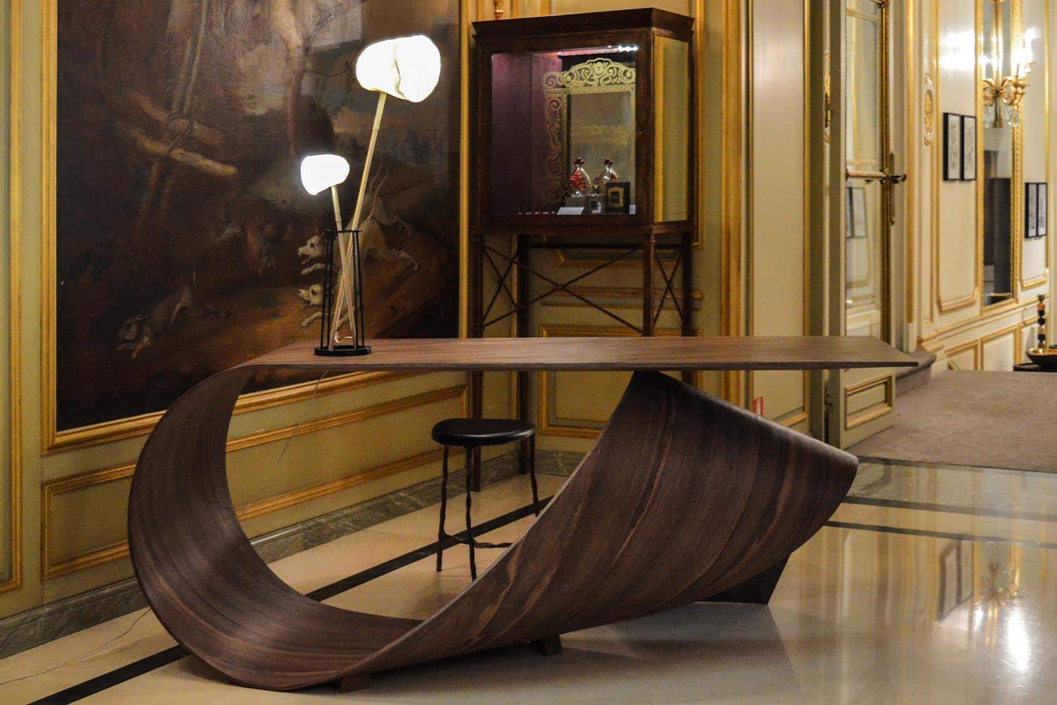 Profitant des rendez-vous artistiques de la Capitale, pendant le PAD Paris et Art Paris Art Fair, maison parisienne s’est installée, en collaboration avec la Galerie Gosserez, au cœur du célèbre Palace parisien : l’Hôtel Le Meurice. A travers cette belle collaboration, le Palace ouvre ses portes aux créations de jeunes designers et à des artistes confirmés qui marquent leur époque par leur inventivité et leur savoir-faire. Les galeries Gosserez et maison parisienne vous accueillent dès le hall de réception avec des pièces remarquables qui vous guideront par la suite vers le restaurant Dali et la galerie Pompadour. Le parcours se termine dans l’historique galerie Castiglione, au sein de laquelle les œuvres ont trouvé une place d’exception. Alliance subtile du bel objet et du savoir-recevoir, rencontre de charme entre le meilleur de la tradition française et le service haut de gamme d’un Palace.