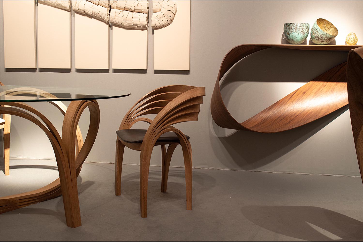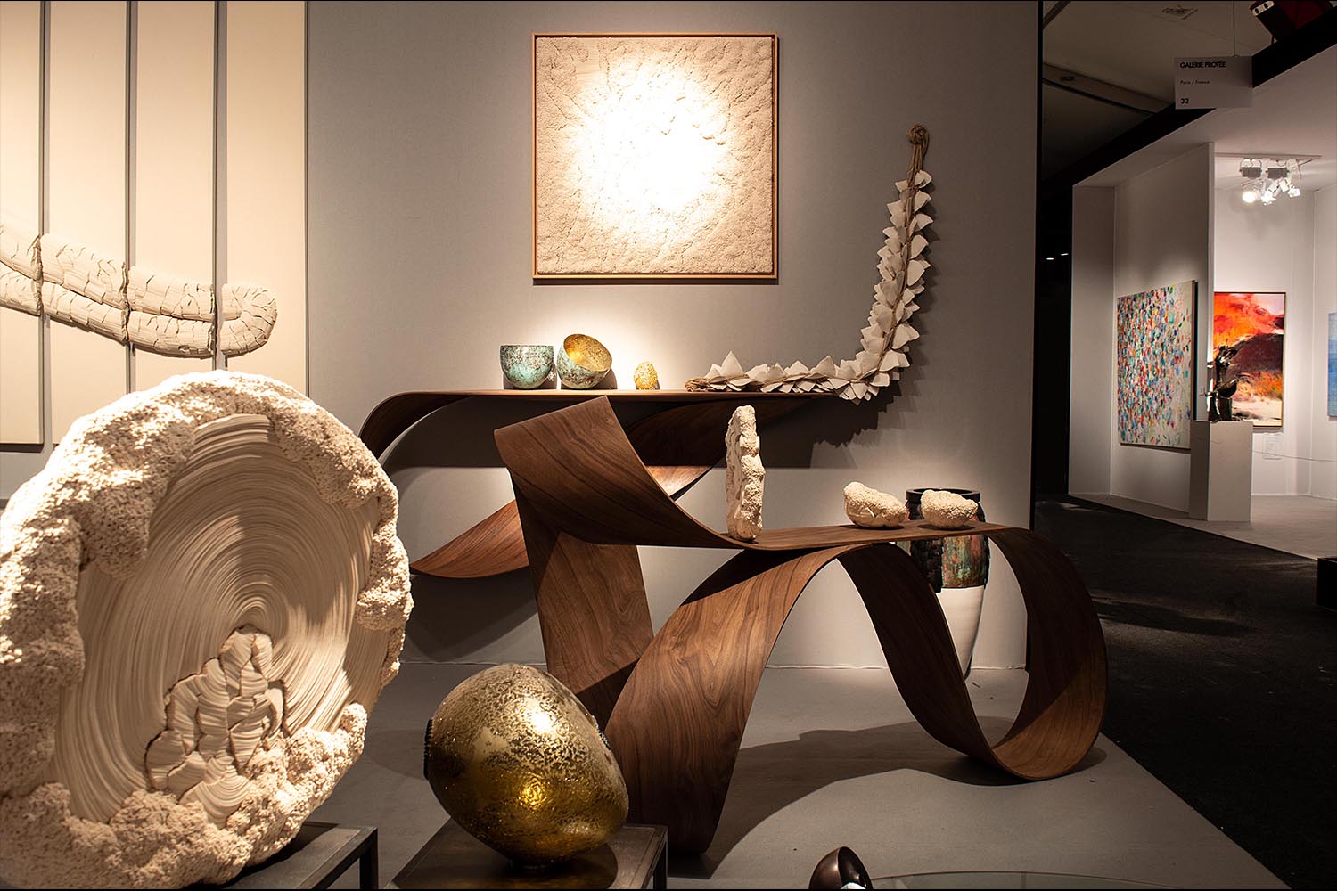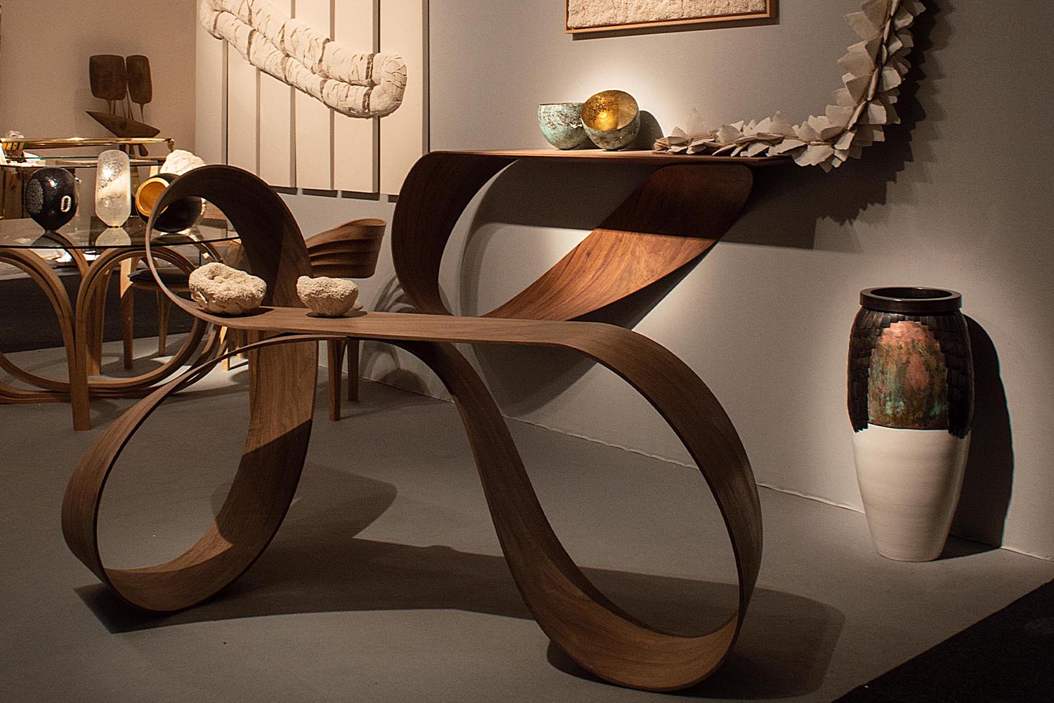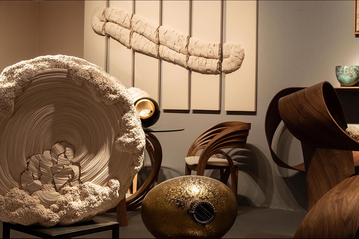 Pour sa toute première participation au salon PAD Paris, prestigieuse vitrine des arts décoratifs et de la création contemporaine, maison parisienne propose une sélection des plus belles œuvres de ses artistes de la matière, autour du travail du métal, du bois, de la céramique, du textile et du verre. Les pièces exposées sont propres à surprendre. Du bois élégamment courbé, la finesse des sculptures en cuivre martelé au fil du temps, de la dentelle qui s’avère être en verre…