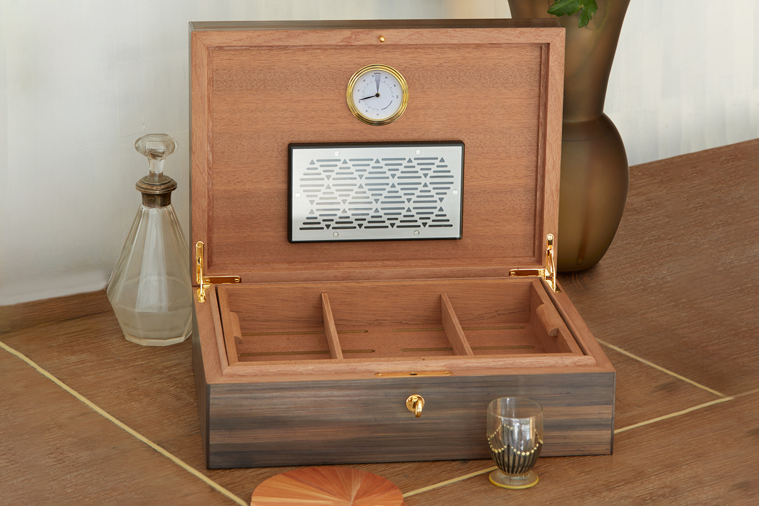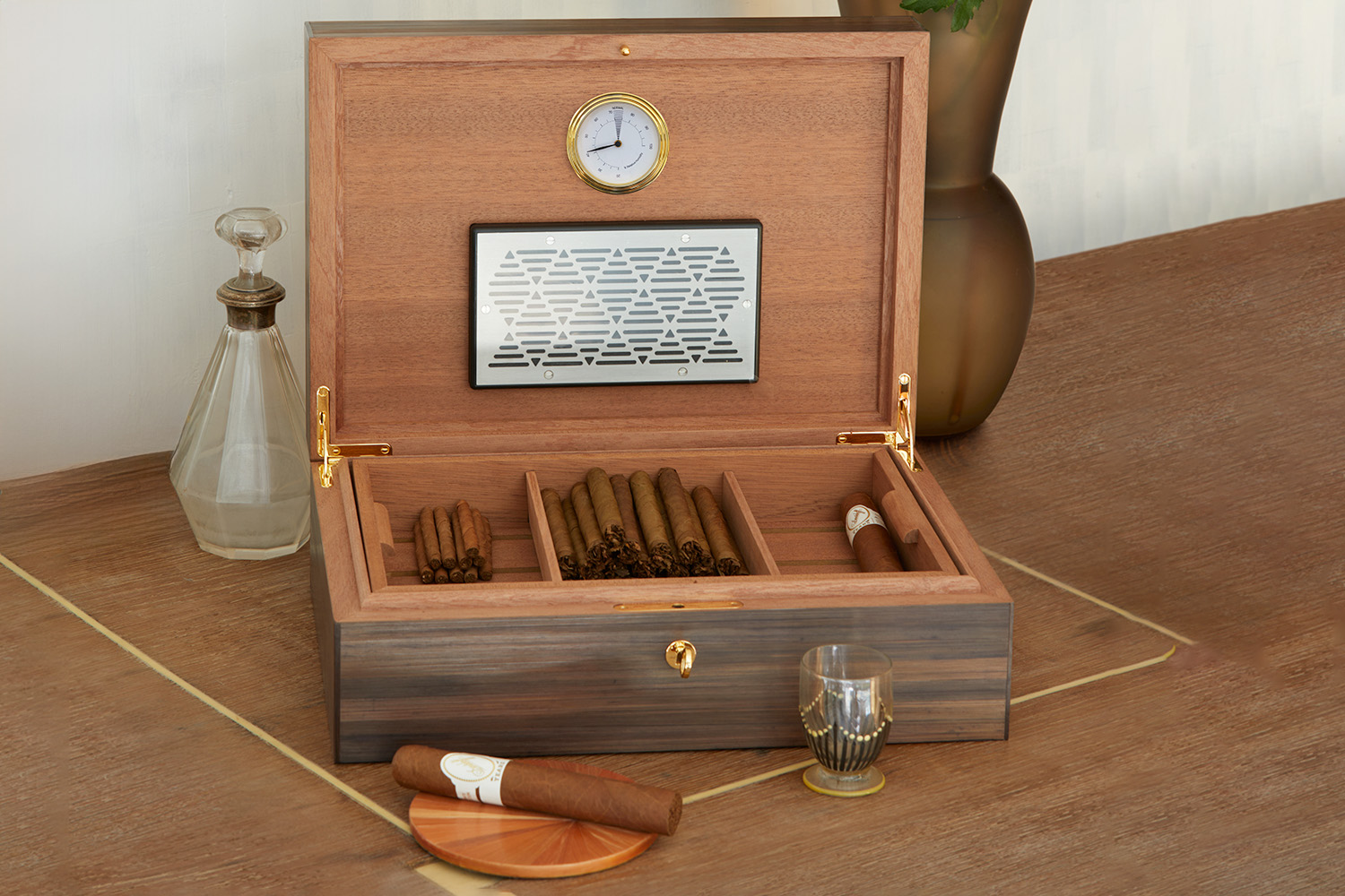 Cave à cigares en marqueterie de paille et intérieur en sipo. Marqueterie inspirée d’un motif de papier peint d’André Groult. Humidificateur et hygromètre intégrés.