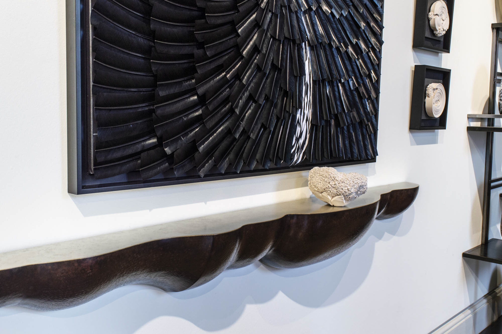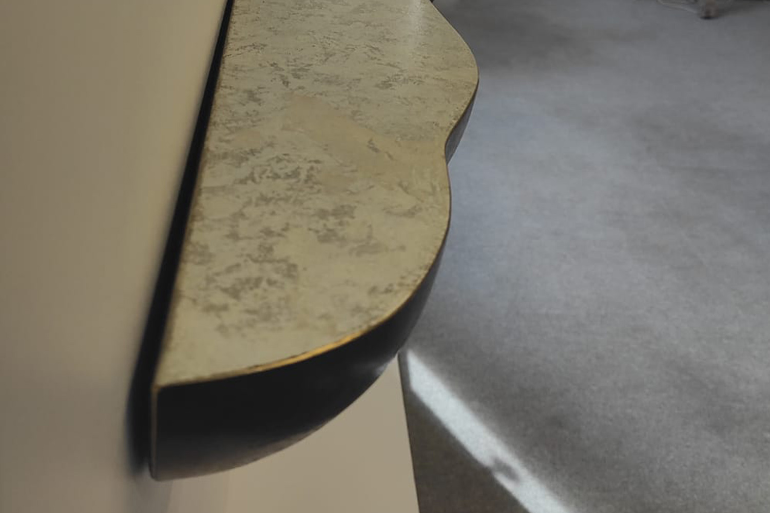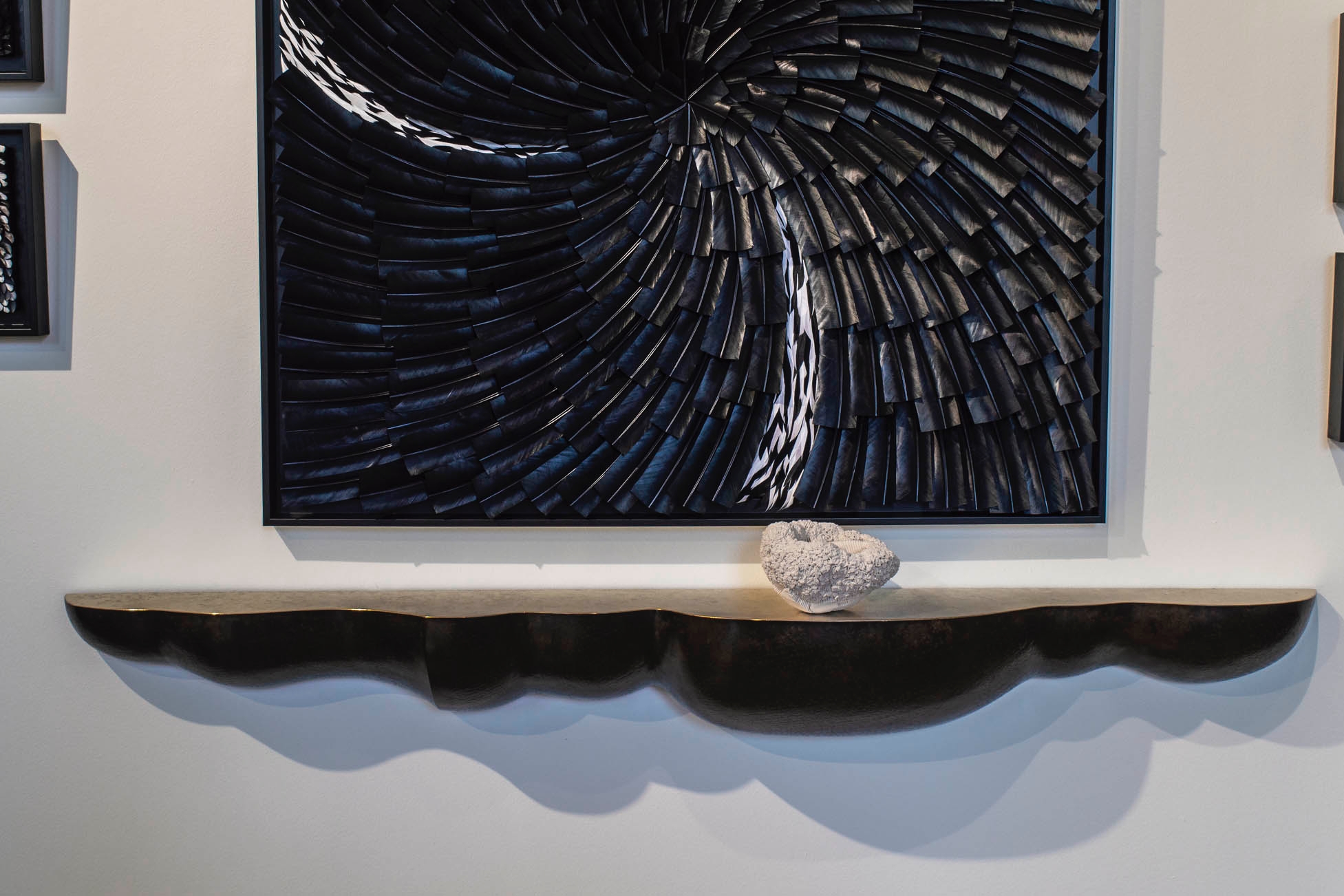 Laiton martelé, patine bronze, feuilles d’or blanc