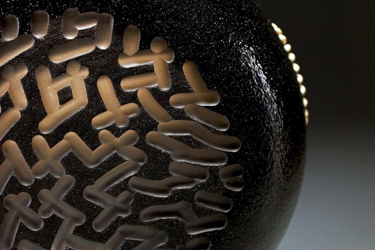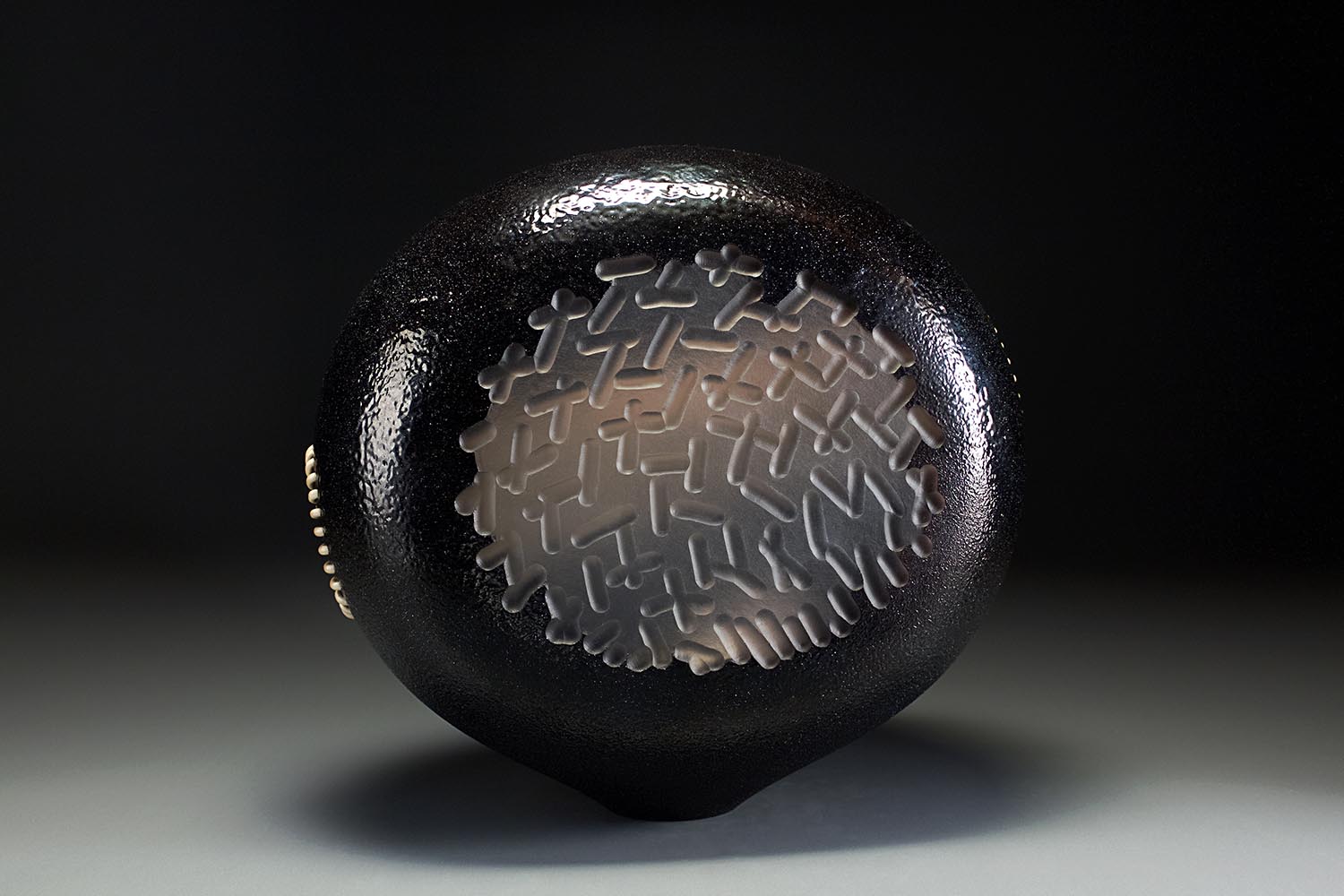 Verre soufflé transparent, émaillé noir moucheté blanc, gravé à la fraise diamantée, un canal en cuir tressé ivoire