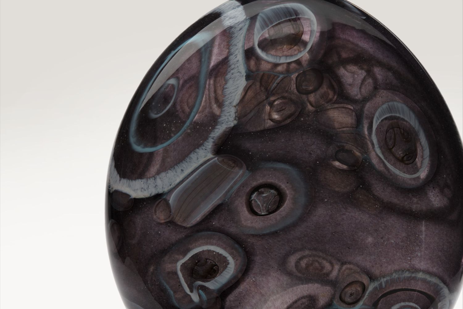 Verre soufflé à main levée, travail du fond en mélange de poudre de couleur noir et gris, intercalaire de murrines coloré, socle inox poli