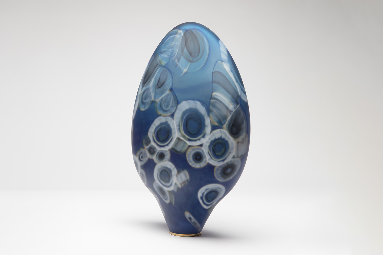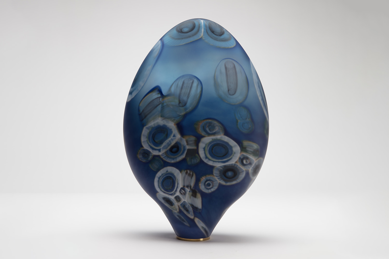 Verre soufflé à main levée bleu azur translucide, travail du fond en moirage de poudre bleue, intercalaire de murines colorées, socle inox poli.