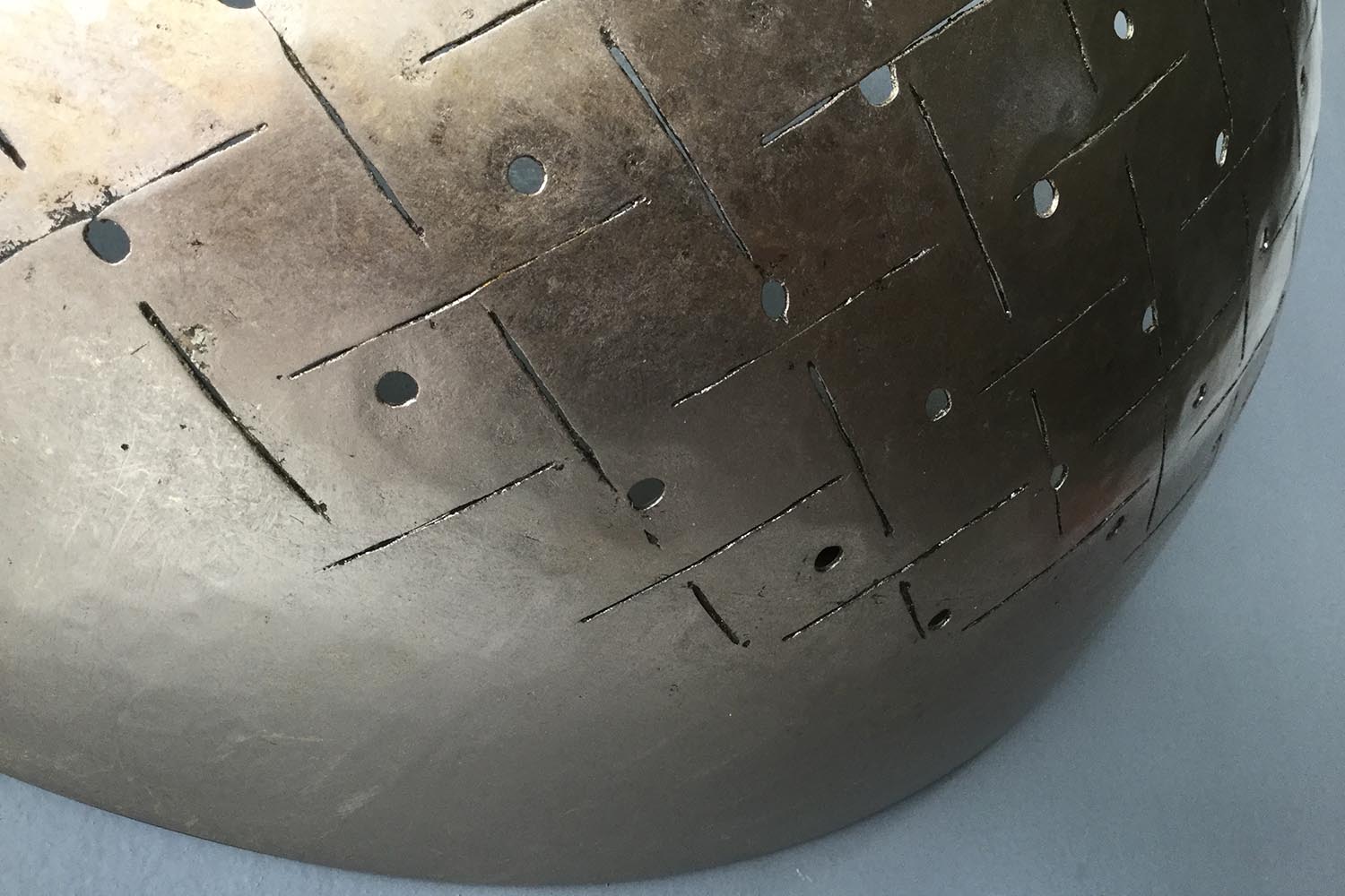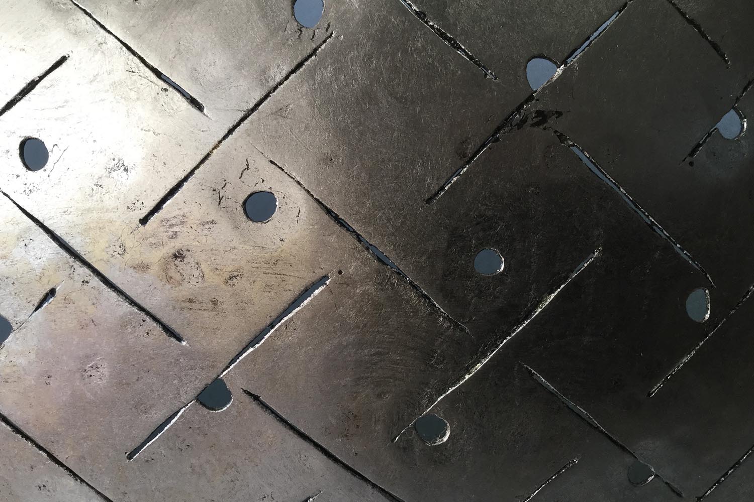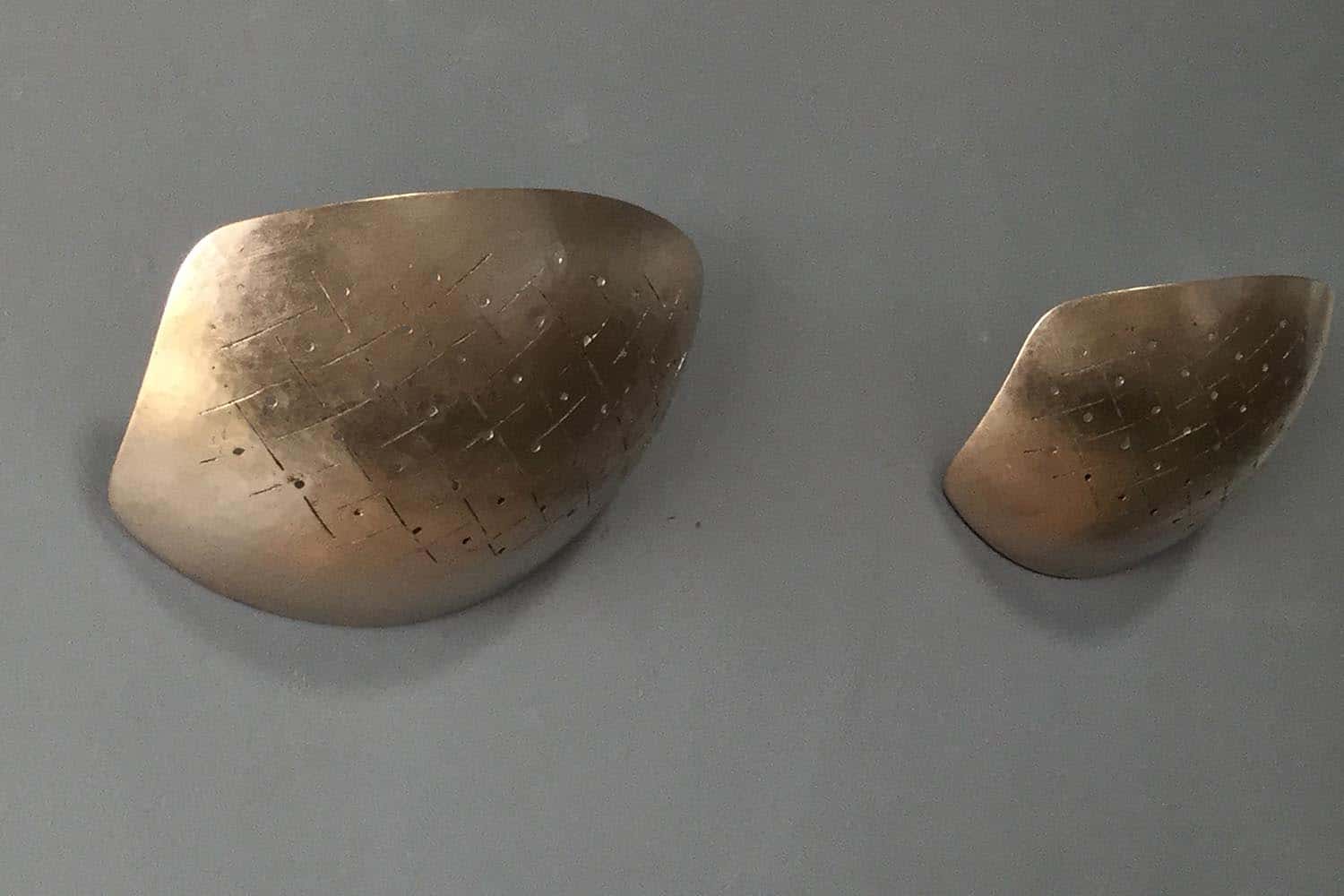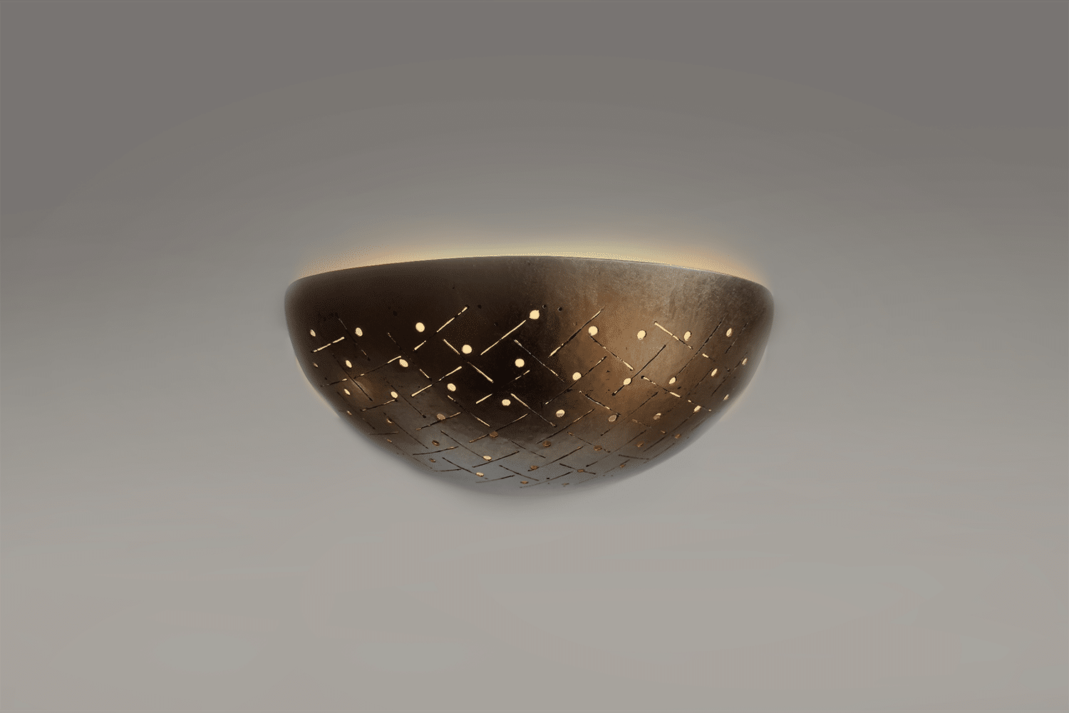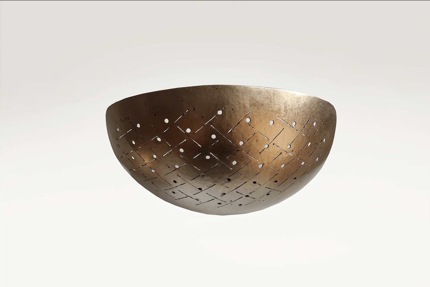 Les appliques murales “Paume” sont recouvertes de feuilles de palladium et d’or “clair de lune” pour un rendu irisé qui est rehaussé par le jeu d’ajours et de quadrillage, inspirés par les motifs brodés sur les vêtements traditionnels des empereurs chinois. Particularité subtile de ce quadrillage : le positionnement des points, qui ne sont ni centrés ni alignés.