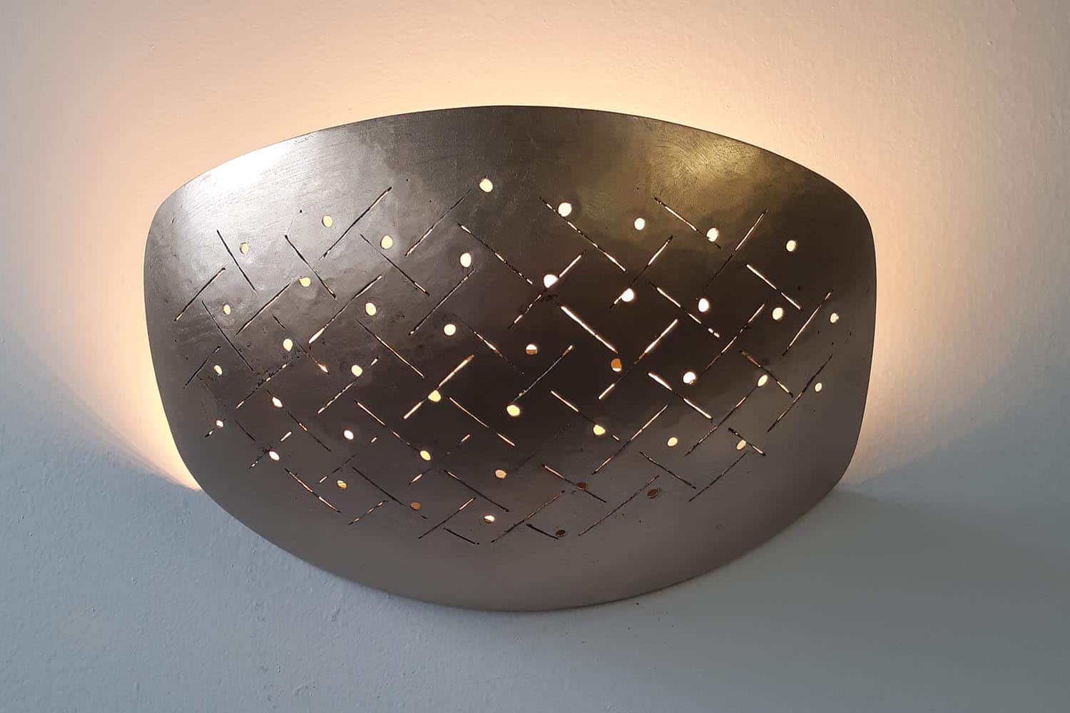 Cuivre martelé et ajouré, feuilles de Palladium, feuilles d’or clair de lune, bande LED avec transformateur