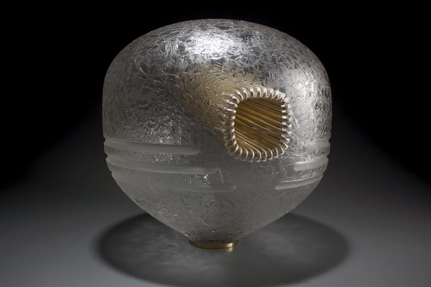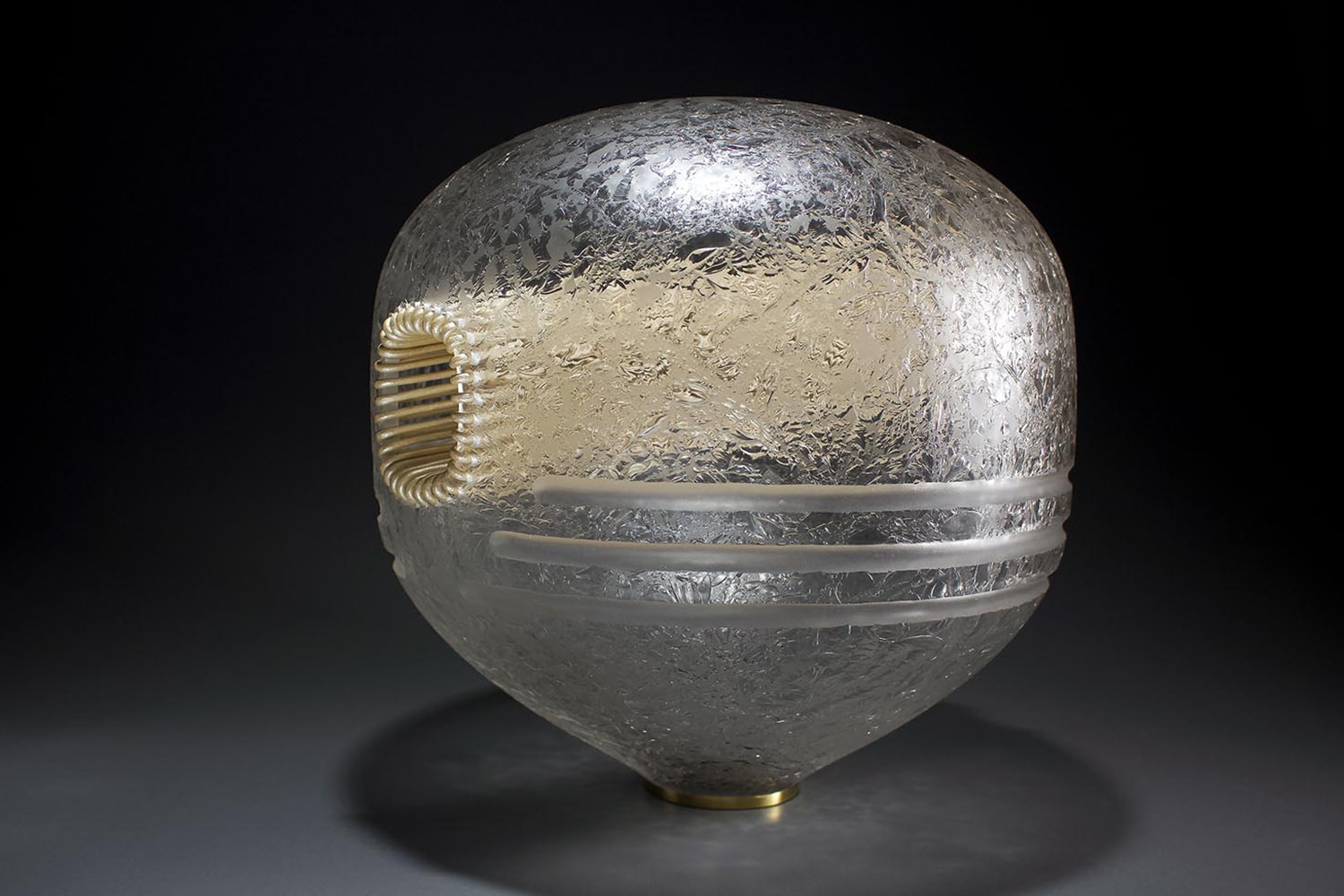 verre soufflé transparent, effet givrage, gravé à la fraise diamantée, un canal en cuir tressé couleur nacre
