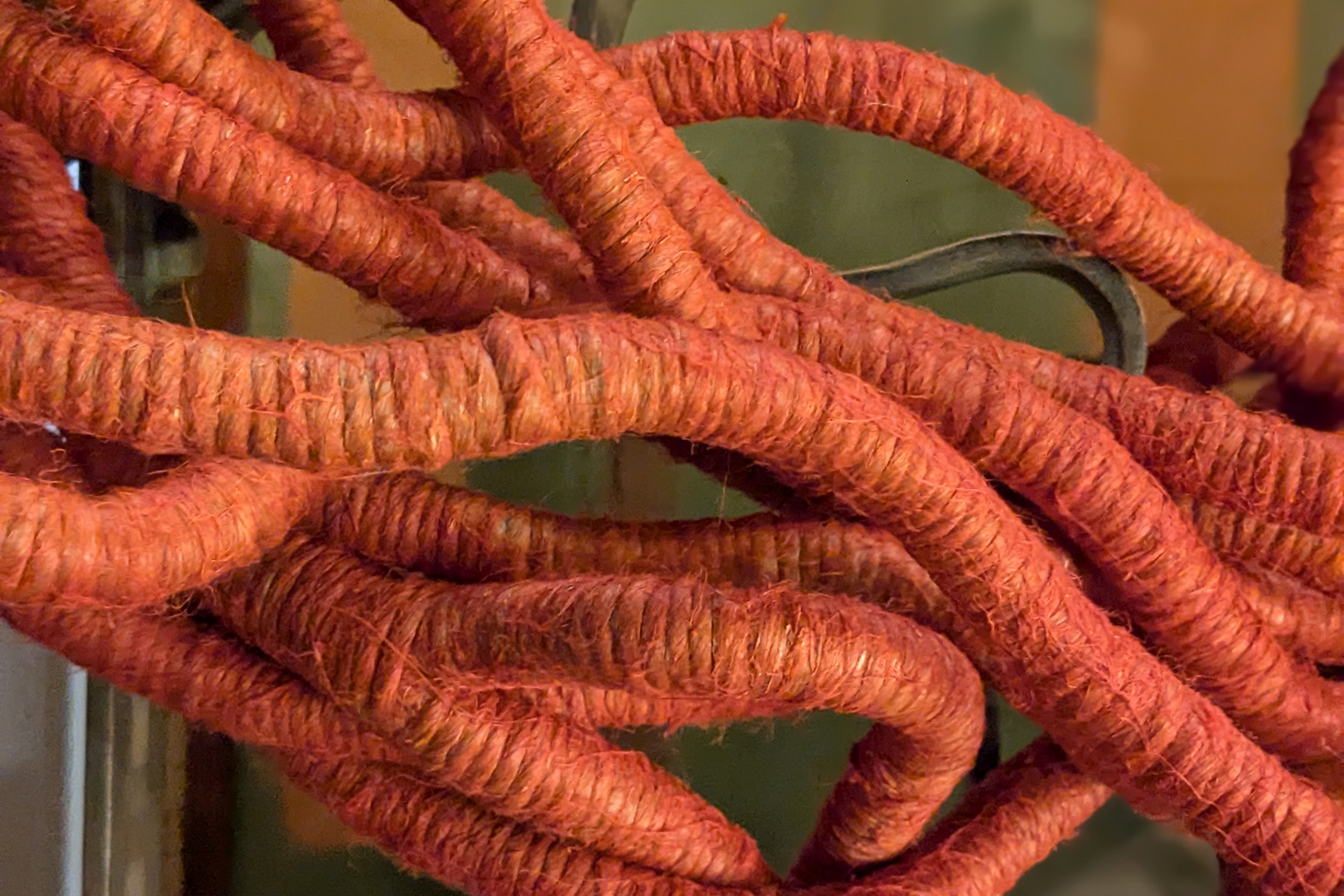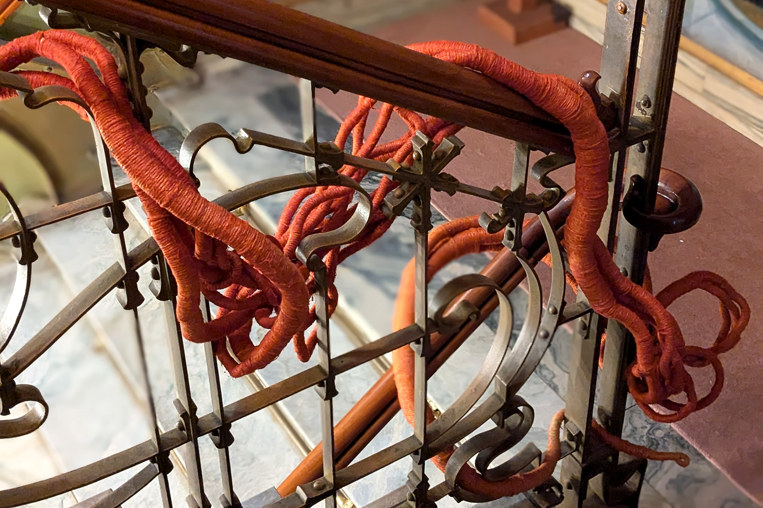 Lin sculpté, teinture à chaud rouge et encre.