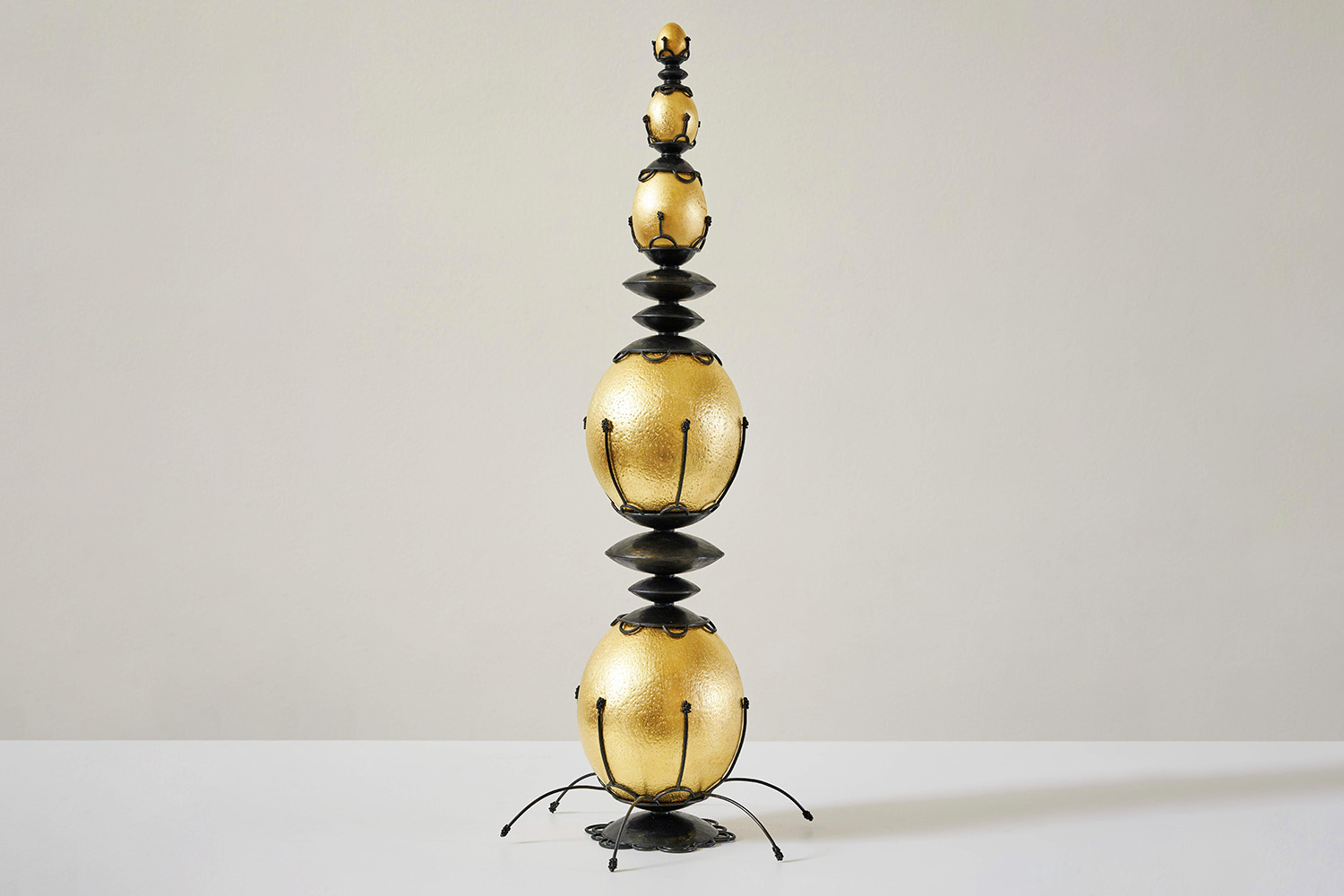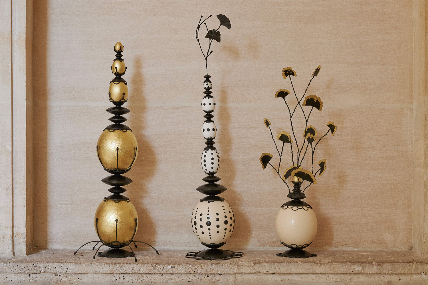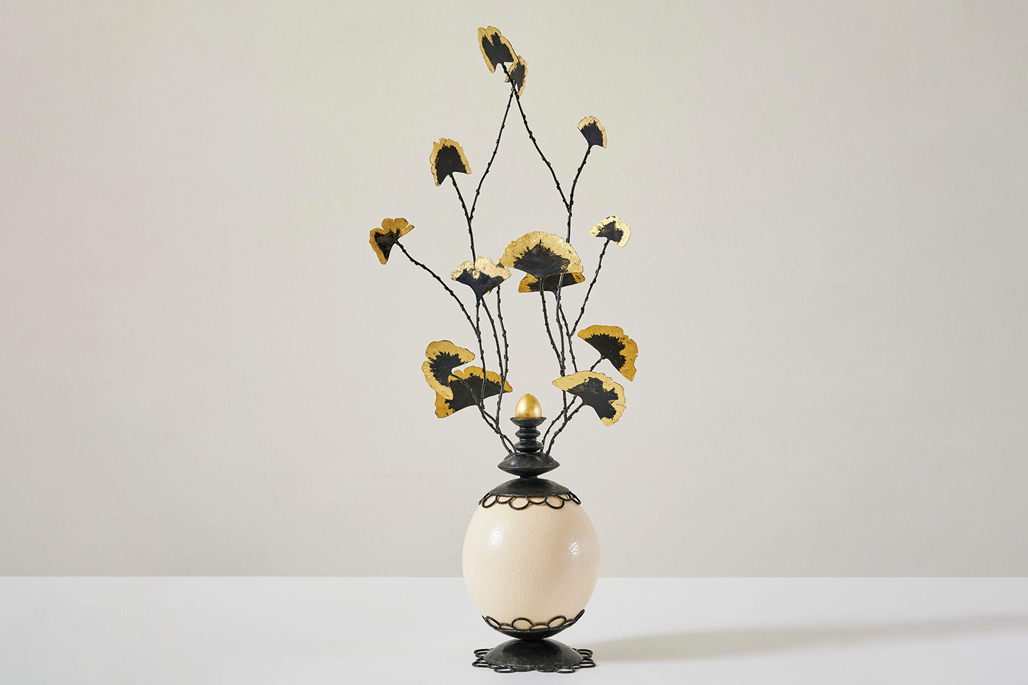 Œufs d’autruche, d’oie, de poule et de caille, métal, maillechort et feuilles d’or